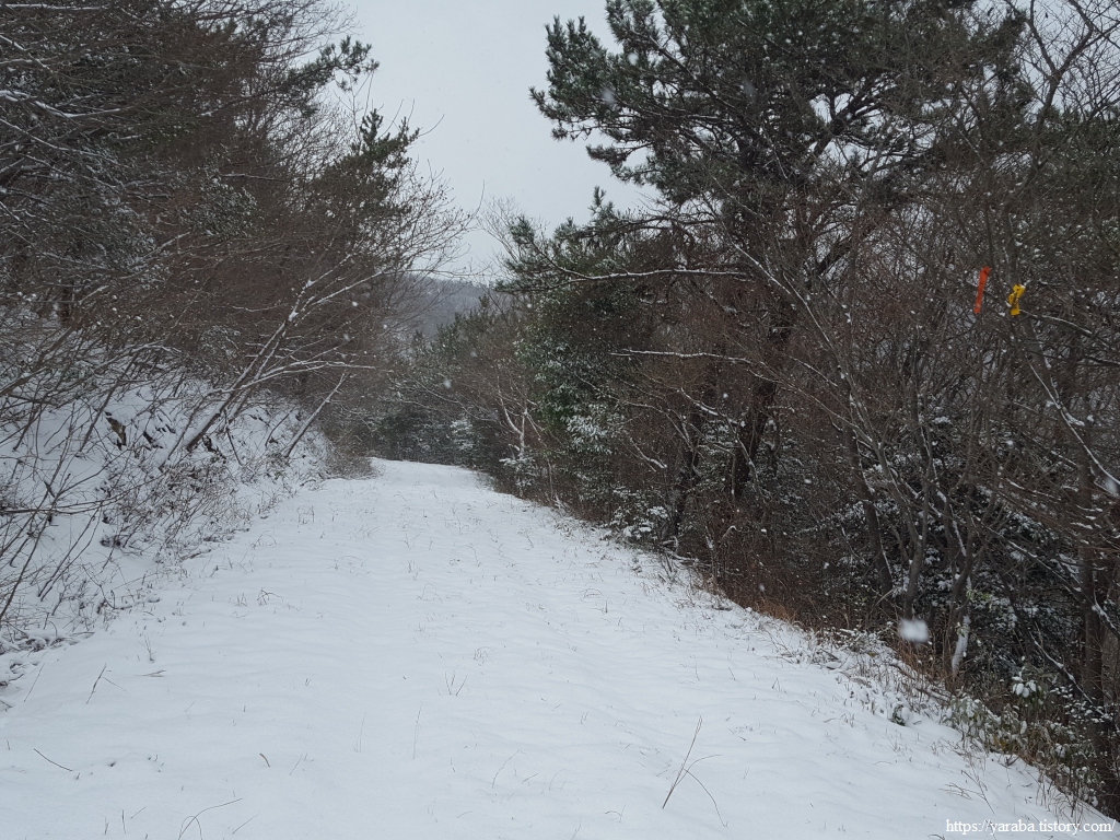 멀리 깊게 내륙으로 들어온 굴포리 바다를 보면서 도로를 벗어나 천둥산 임도로 진입한다. 역시 이곳도 아무도 지나지 않은 눈길이다. 신발 깊이로 쌓인 눈길을 뽀드득뽀드득 밟으며 길을 이어간다.