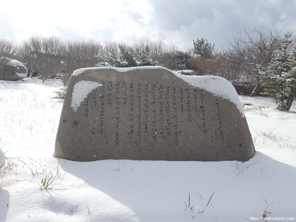 도로변에 작은 공원이 있었는데 날씨는 싸늘하지만 시비에 새겨진 시 한 편 읽고 간다. 이향아 님의 "여름산을 바라보고 있으면"이다. 시인은 여름산을 보면서 죽음을 떠올렸는데, 첩첩산중에서 눈 속을 걷고 있다면 아마도 죽음을 생각하지 않았을까 싶다.