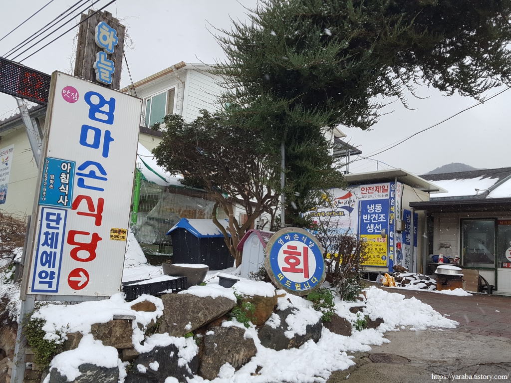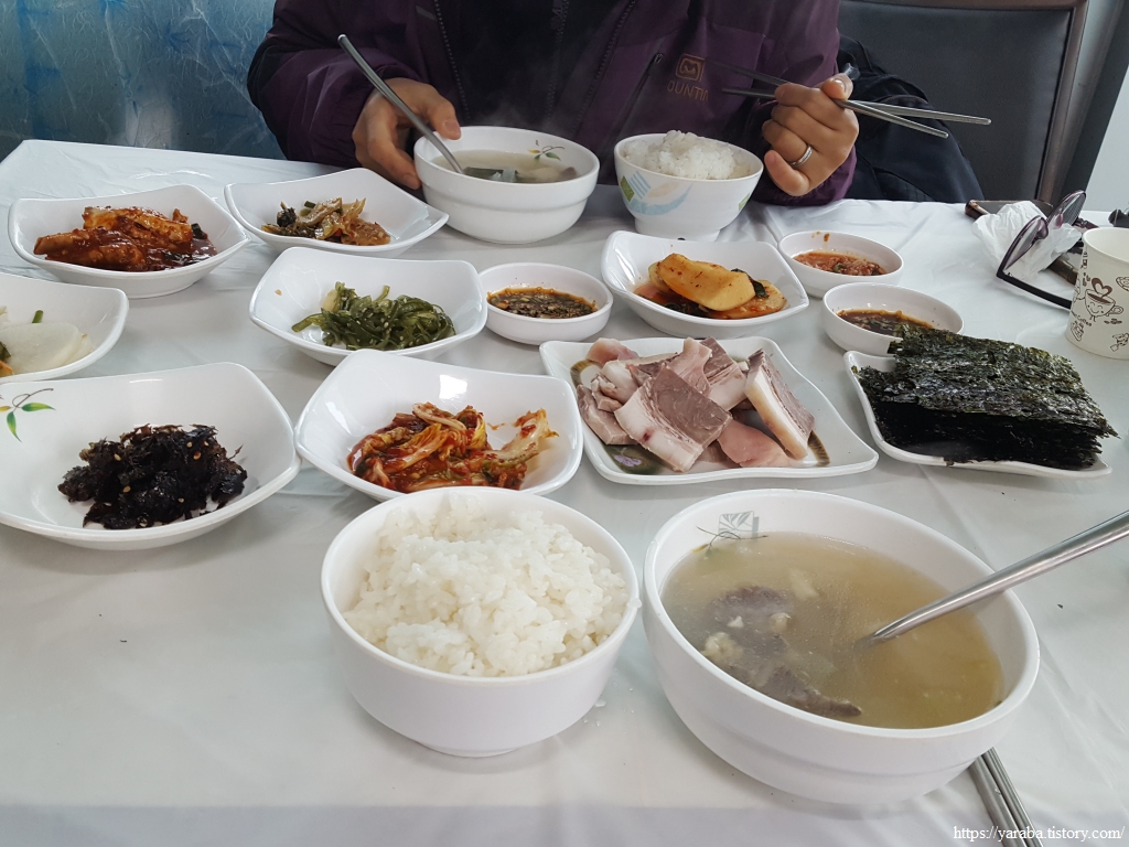 10코스 시작점 인근에는 식당도 여러 개 있었고 편의점도 있어서 쉬어가기 좋은 곳이었다. 우리는 엄마손 식당에서 백반으로 점심식사를 했는데 가격이 싸지는 않았지만 뭇국도 일품이었고, 구운 김이 기억에 남을 정도로 맛이 좋았다. 썰어 나온 돼지고기도 훌륭했다. 얼었던 몸도 녹이고 넉넉한 휴식 시간도 가질 수 있어서 좋았다.