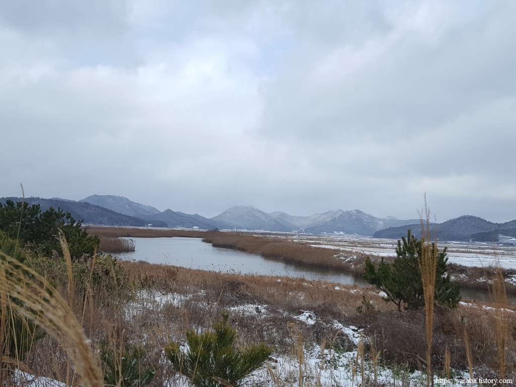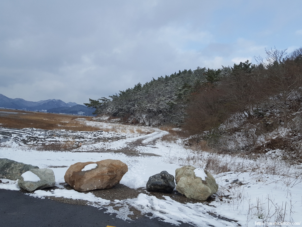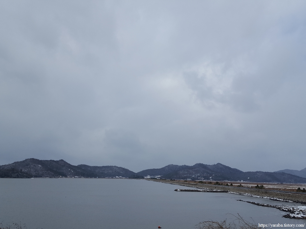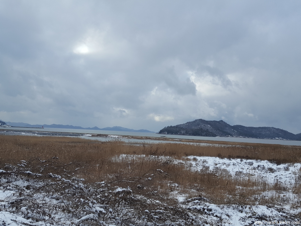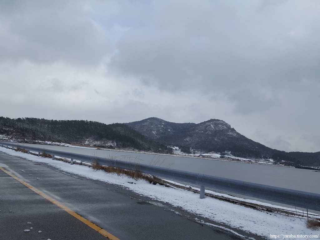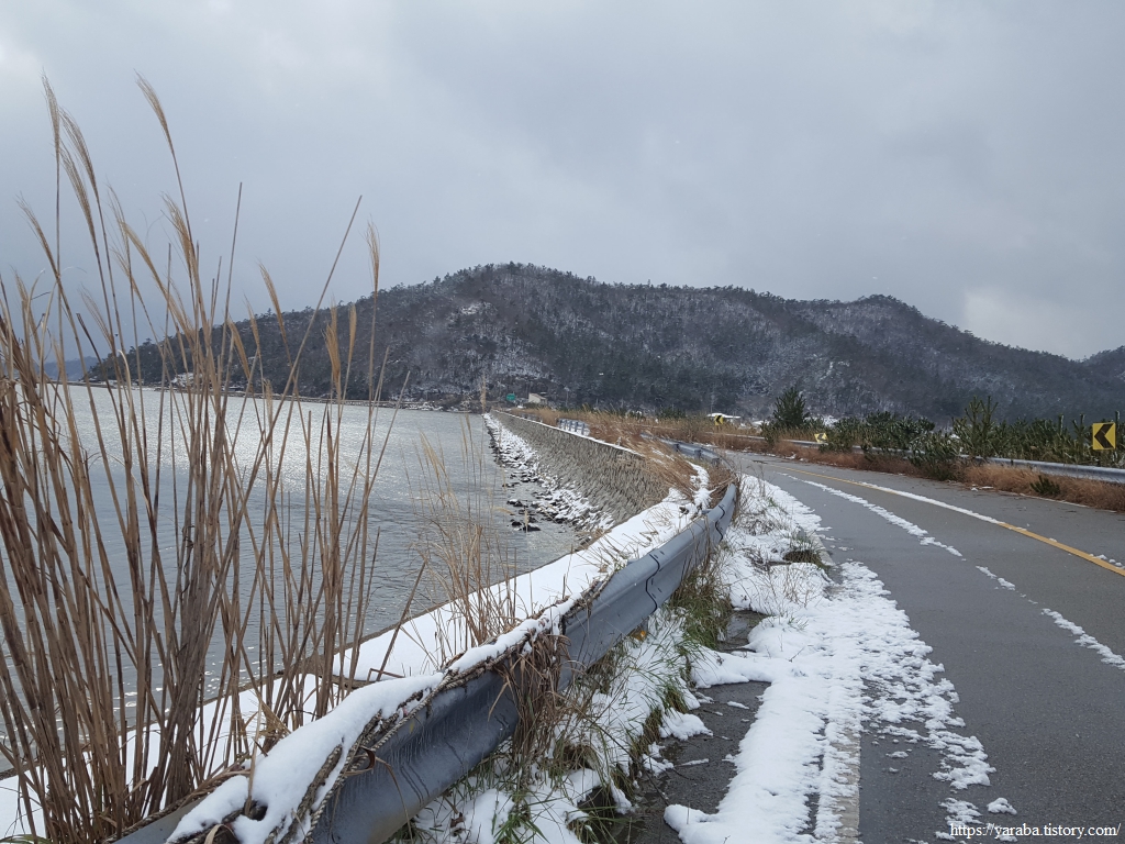 방조제를 벗어나면 좌회전하여 마사선착장으로 향한다. 앞서 지나간 산악회 일행들이 눈길에 찍어놓은 발자국들이 어지럽다.