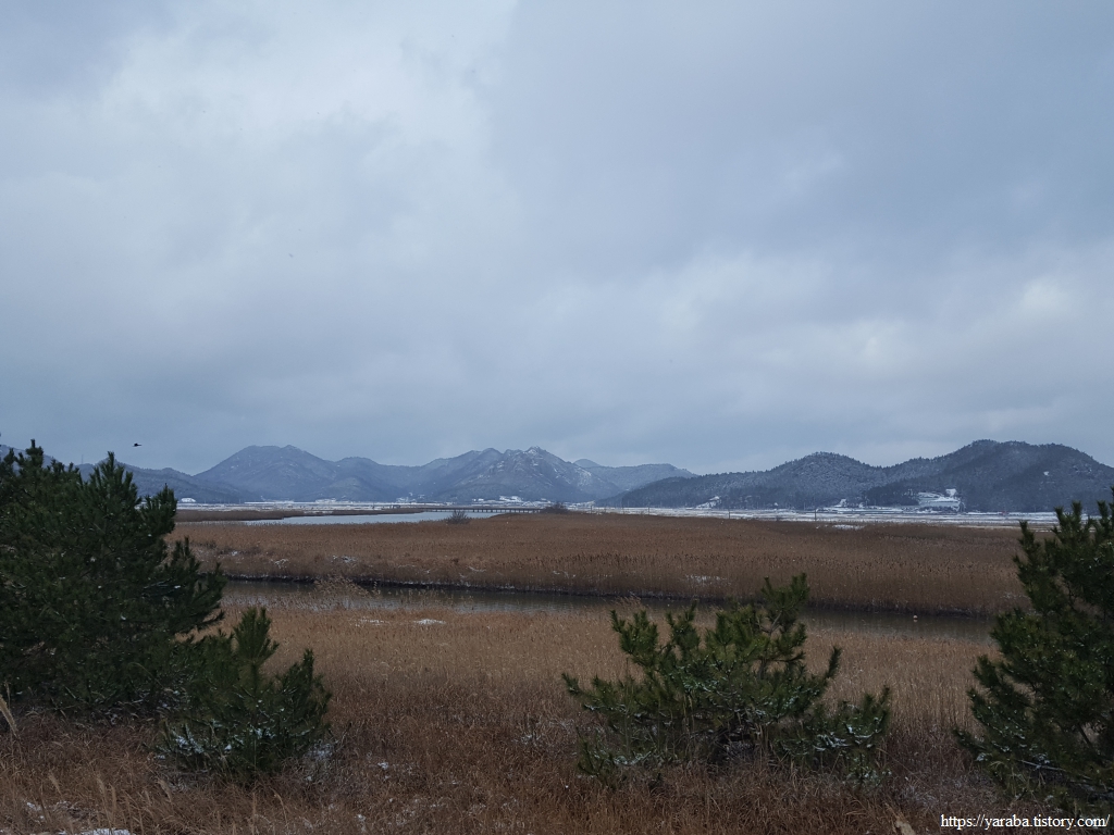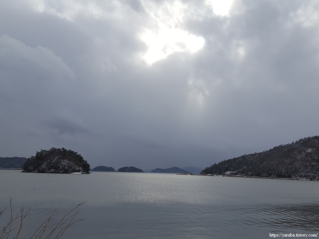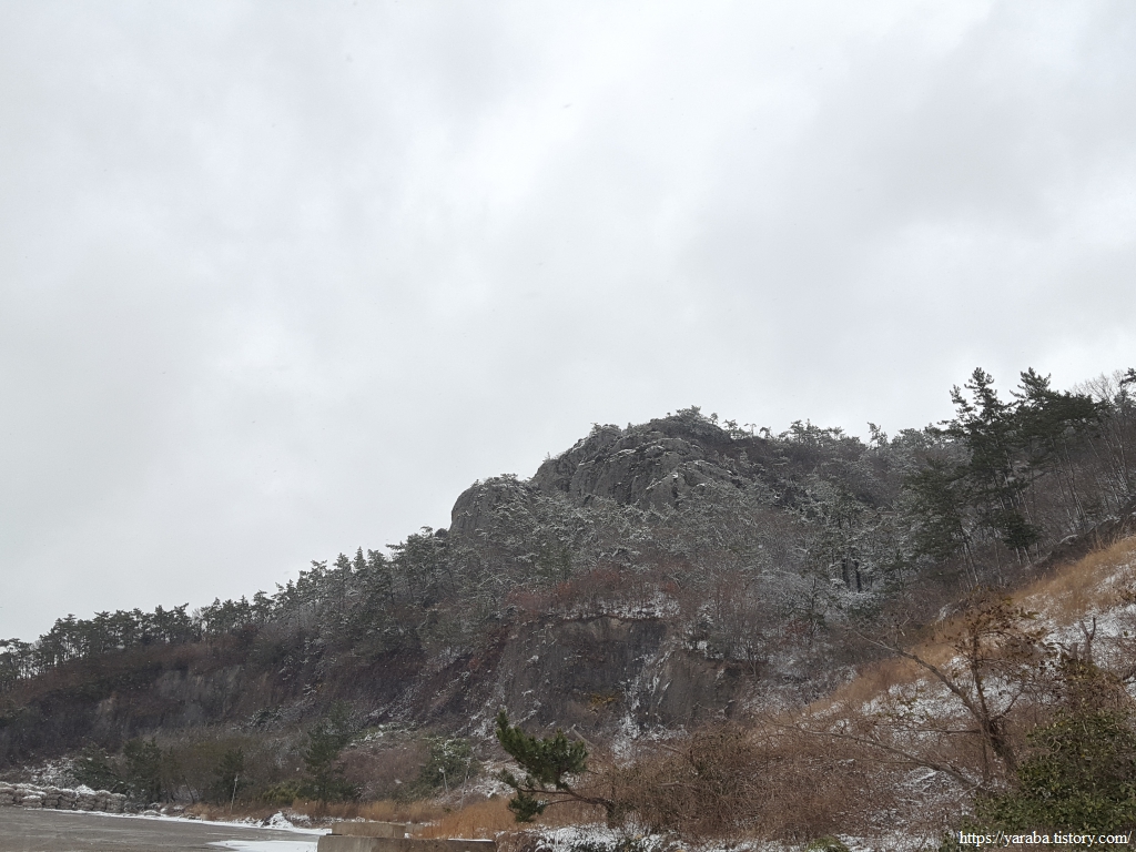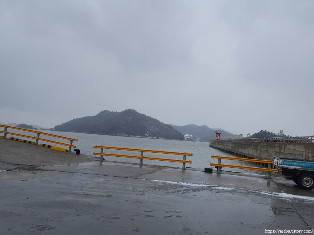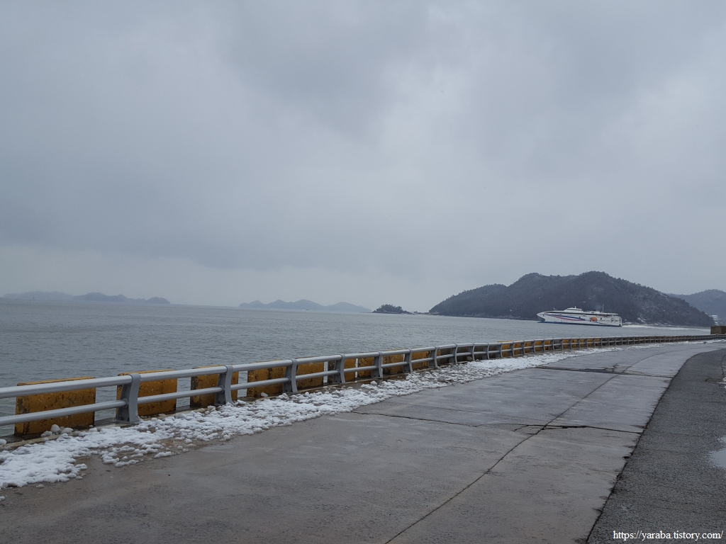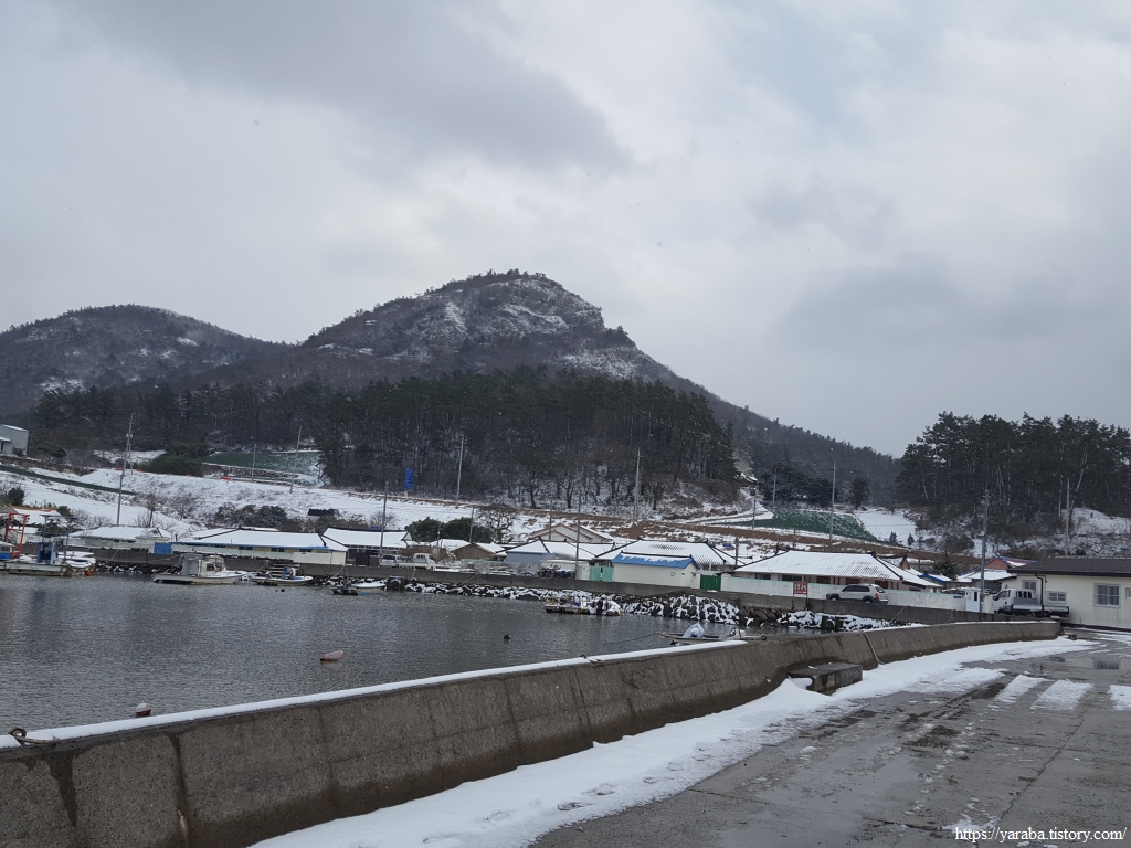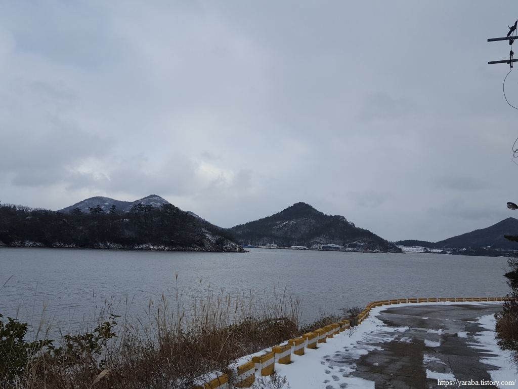 저 멀리 바다 건너로는 팽목바람길로 우리가 걸을 숲길이 있는 야산과 바다로 작게 튀어나온 다신기미도 보인다. 진도항 뒤의 바위산은 소나무와 함께 하얀 눈으로 치장하여 한 폭의 수묵화처럼 보인다.