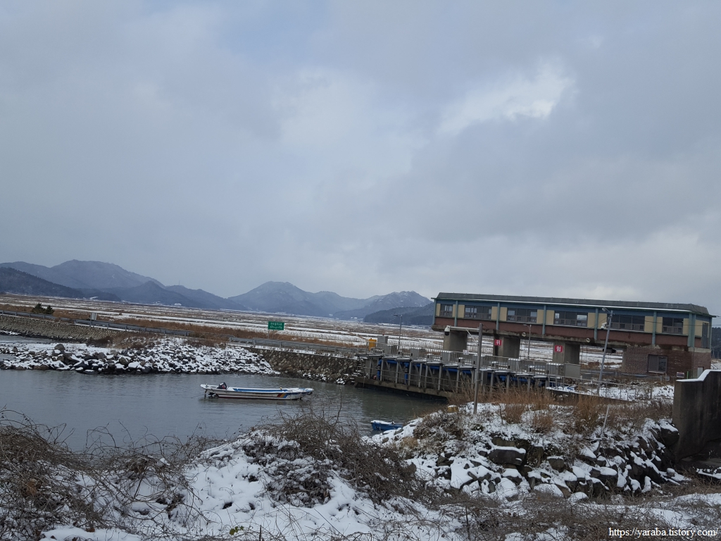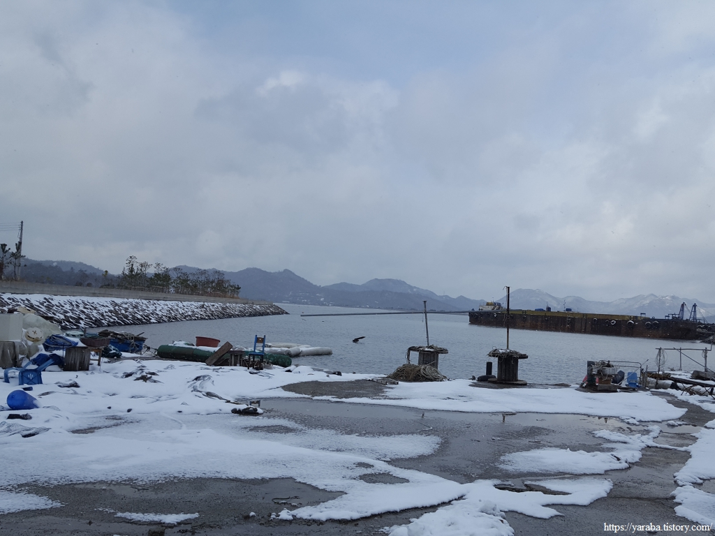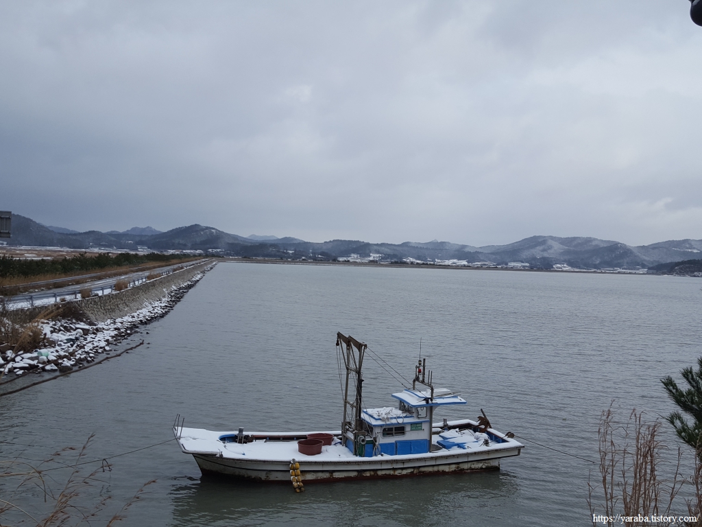 마사선착장으로 향하는 길, 방조제 바깥에 매어놓은 어선도 눈으로 덮였다.