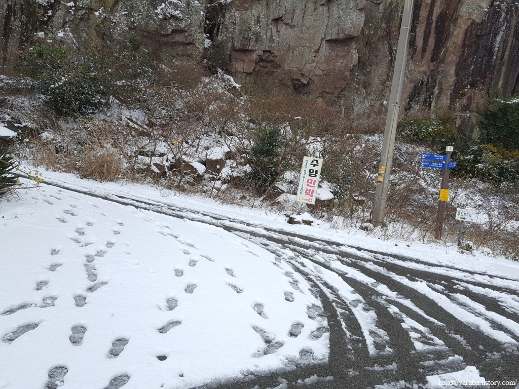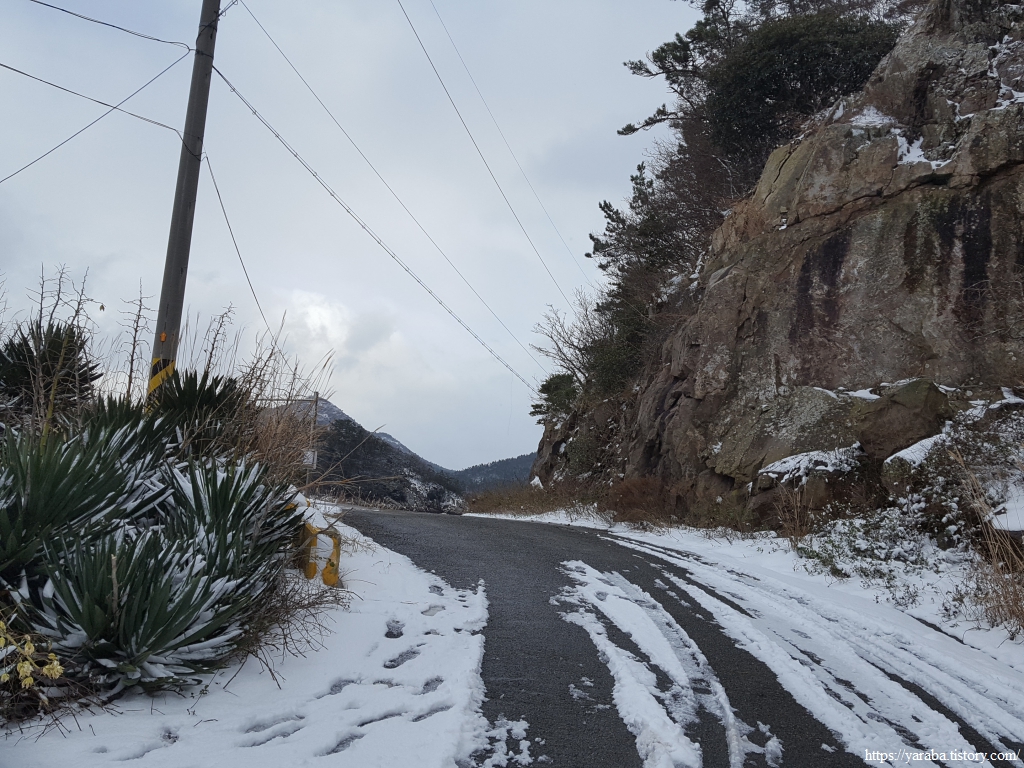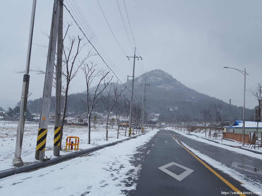 정면으로 마을을 감싸고 있는 한복산(232m)을 보면서 눈발을 헤쳐간다.