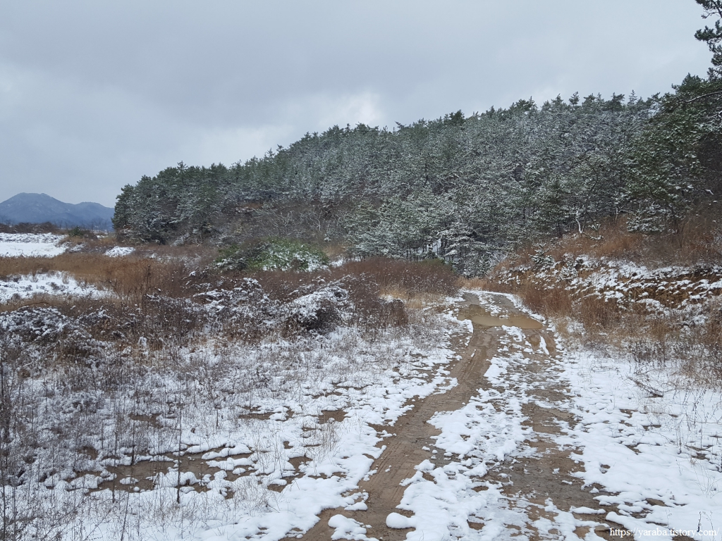산 아랫자락을 따라 이어진 흙길을 따라 팽목방조제 방면으로 이동한다. 때로 물웅덩이를 만나면 갑갑하지만 웅덩이 주위에 조금 얼은 땅은 웅덩이에 빠지지 않고 길을 지날 수 있게 해 준다. 이럴 때는 싸늘한 날씨가 고맙다.