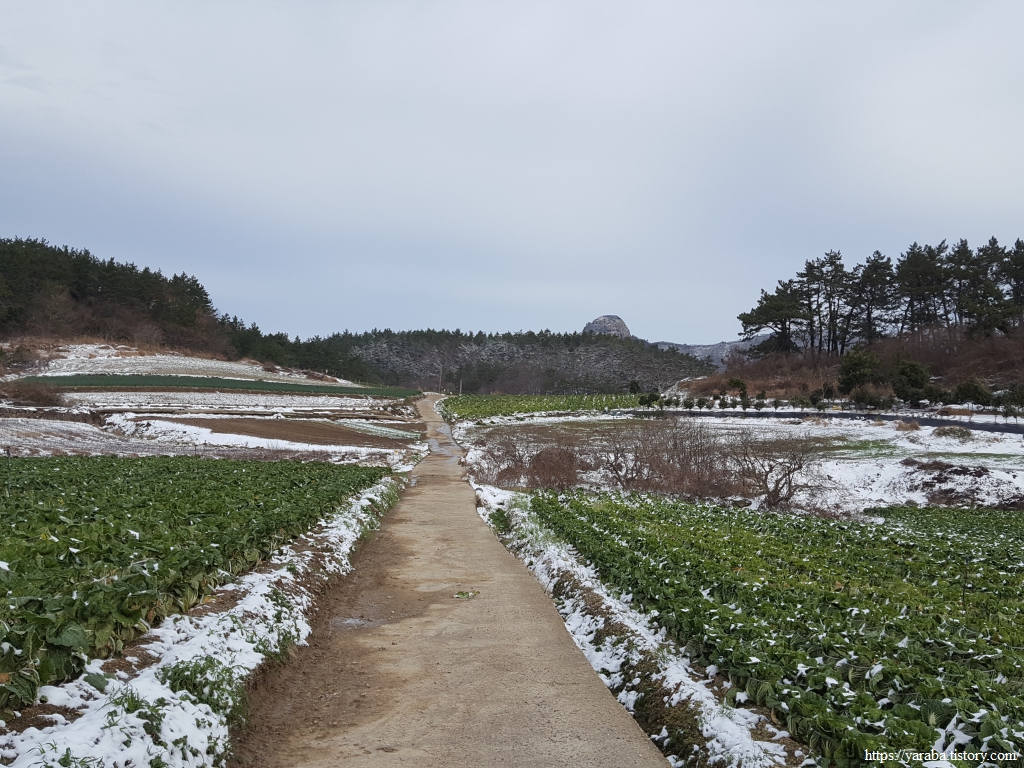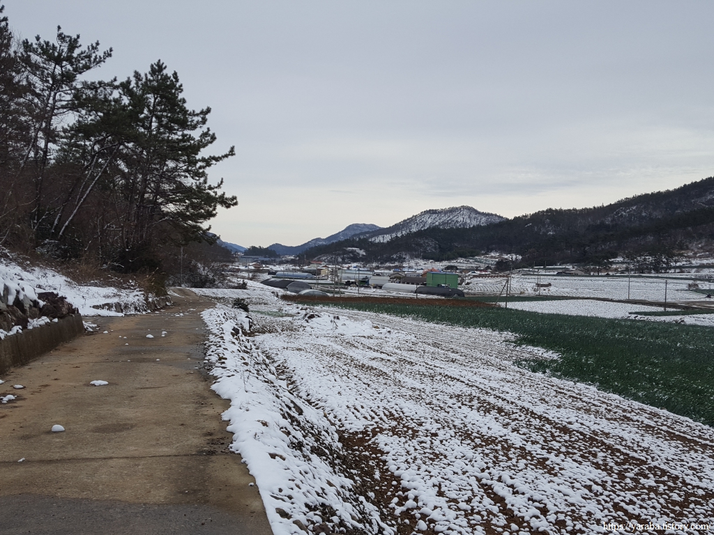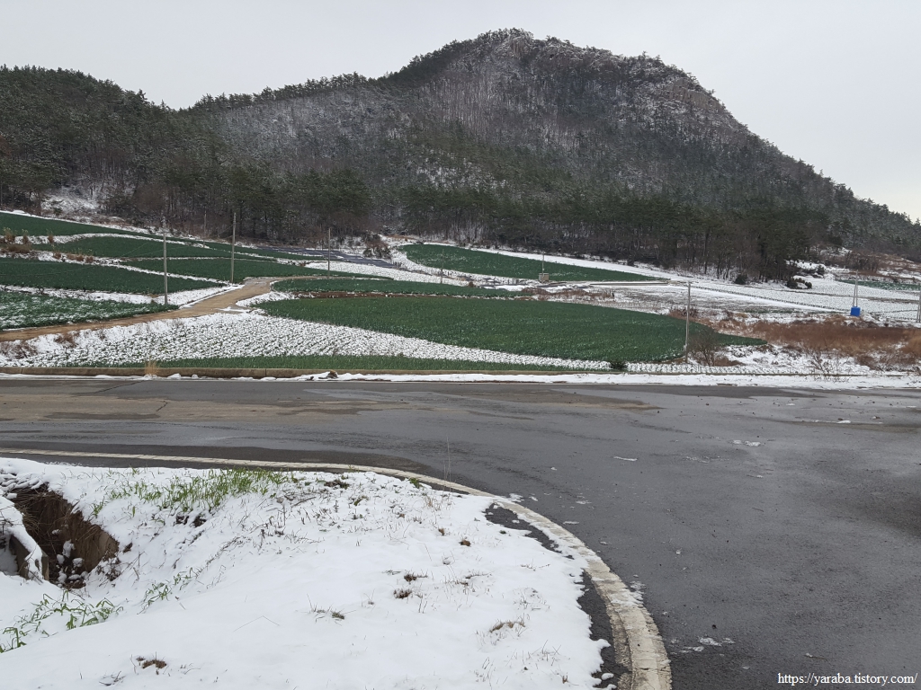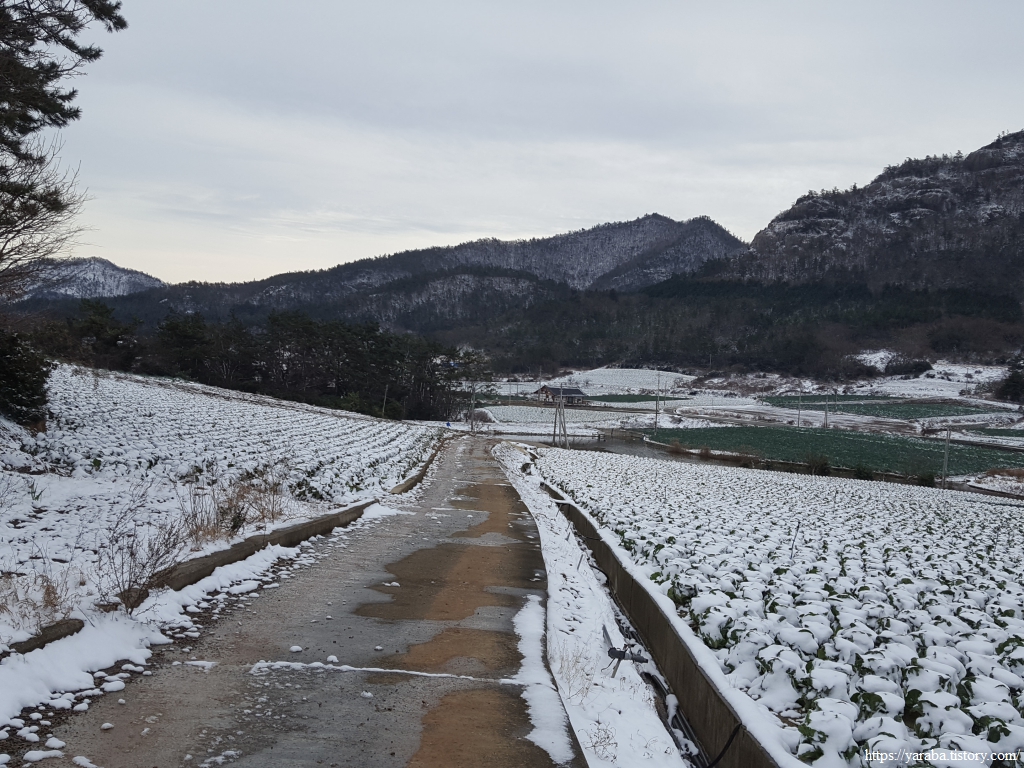 길의 눈은 많이 녹았지만 마을을 둘러싼 산봉우리들과 금노마을의 배추밭이 쓰고 있는 하얀 눈은 배추 설국이다.