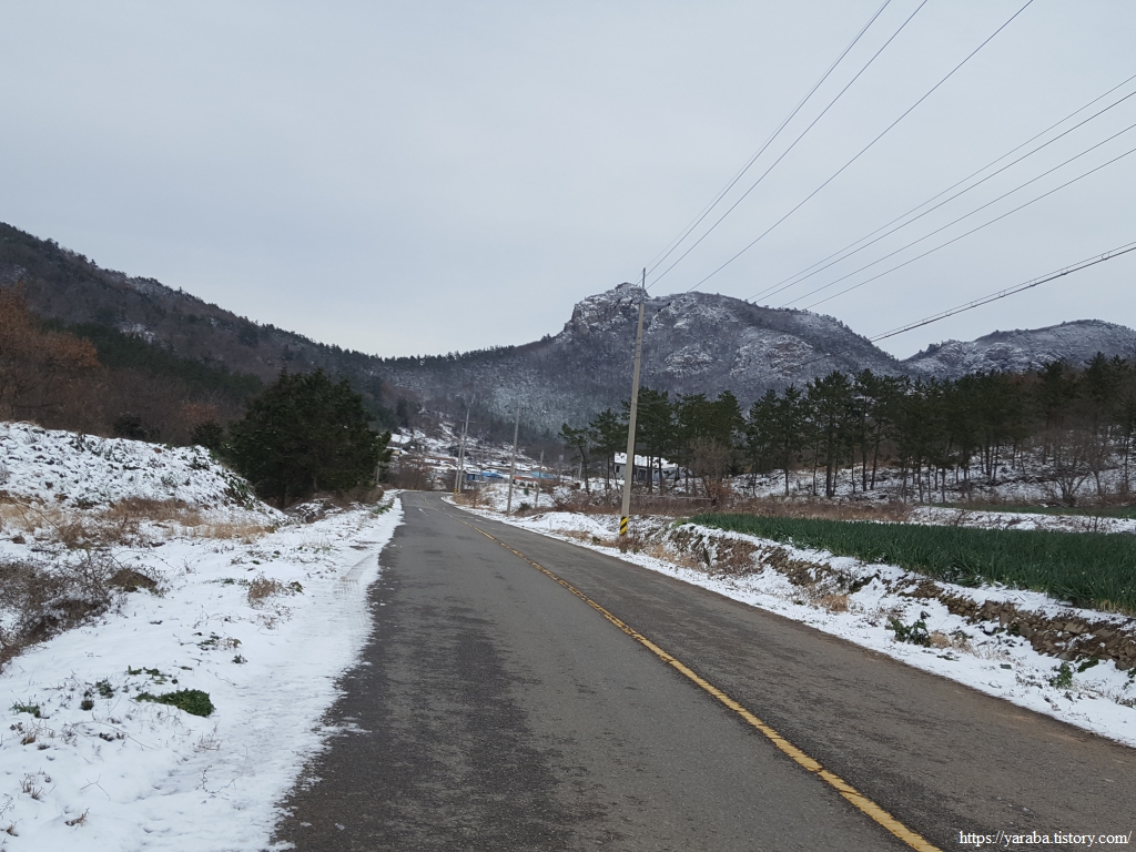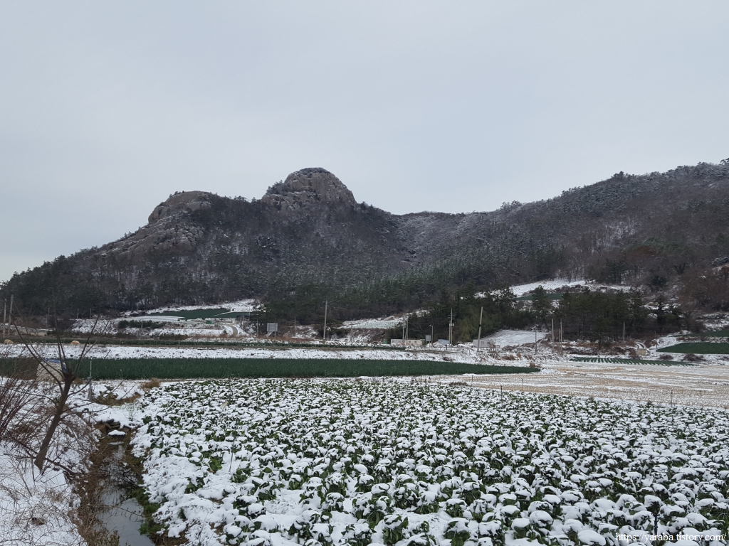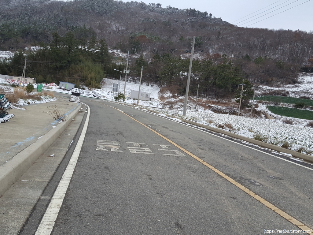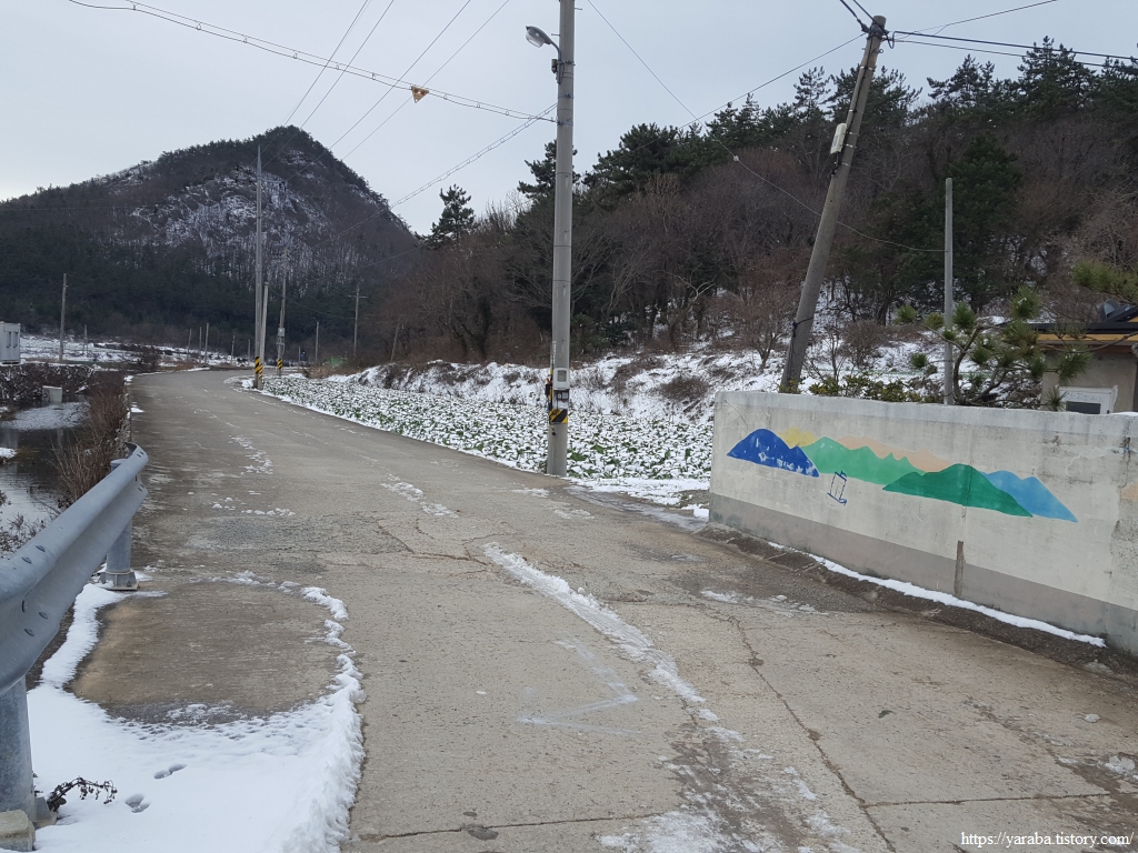 길의 눈은 많이 녹았지만 마을을 둘러싼 산봉우리들과 금노마을의 배추밭이 쓰고 있는 하얀 눈은 배추 설국이다.