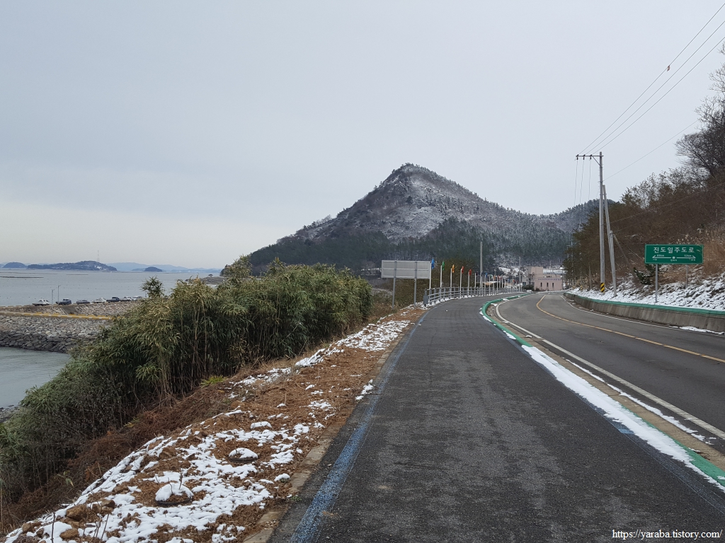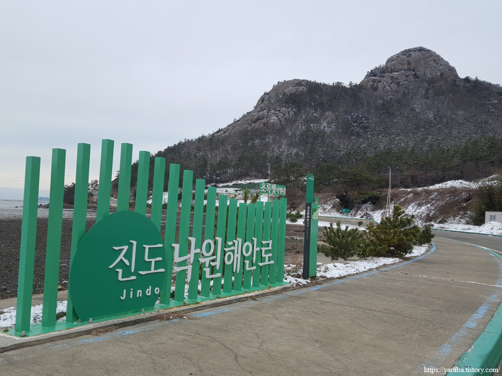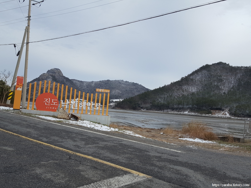 붉은 석양을 테마로 만든 진도 낙원해안로 표지가 등장했다. 주황빛 낙원길이라는 이름답게 해안길을 따라서 세방낙조를 비롯한 아름다운 낙조를 볼 수 있는 곳이다. 도로와 방조제 갈림길에서 좌측으로 가면 세방선착장 이후로 시닉 드라이브(scenic drive) 코스가 이어지며 아름다운 낙조를 감상할 수 있는 해안 도로가 이어진다. 서해랑길은 직진하여 방조제 길로 나아간다.