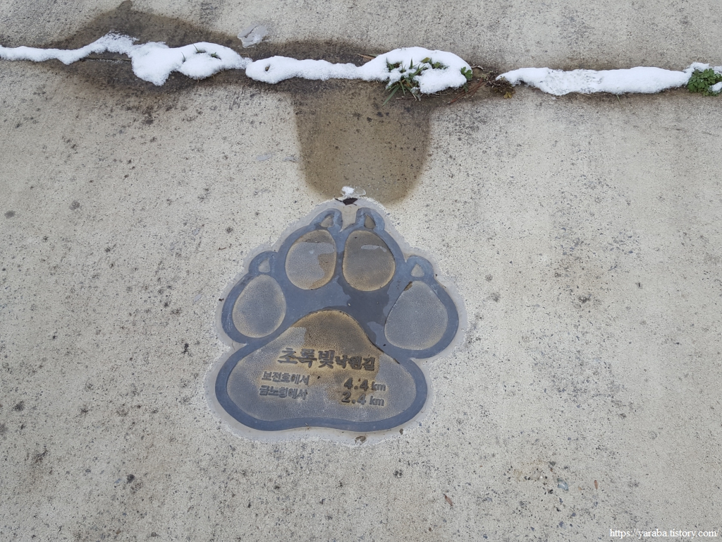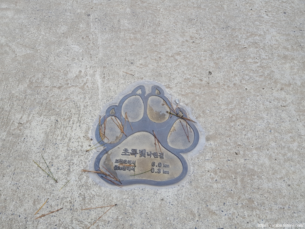 초록빛 낙원길은 참전복로 도로를 따라서 넓은 인도가 마련되어 있는 쾌적한 걷기 길이다. 인도 중간에는 주기적으로 발바닥 표지로 거리를 표시하고 있는데 금노항에서 보전호까지 7Km가 넘는 길이다. 처음에는 커다란 발자국이니 단순하게 곰발자국이지 않을까 생각했는데, 개 발자국 있었다. 진도의 명물 진돗개의 발자국을 새겨 놓은 것이다.