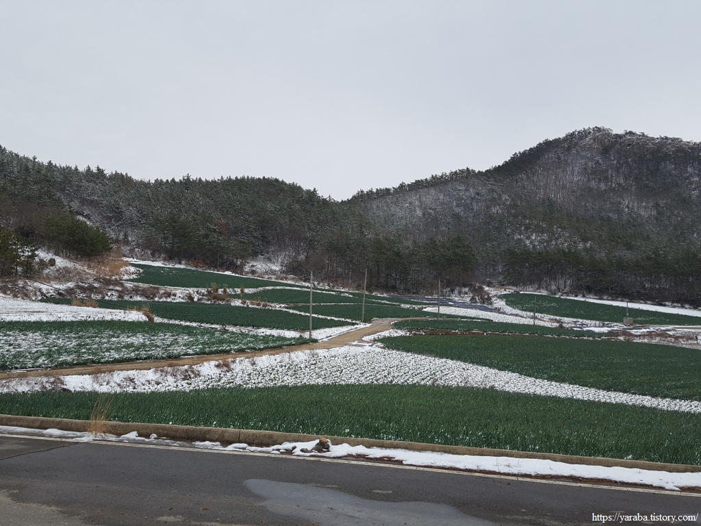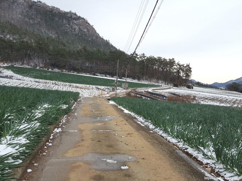 하보전마을로 들어가는 길, 계곡 사이의 밭으로는 눈을 머금은 대파밭이 푸릇푸릇하다.