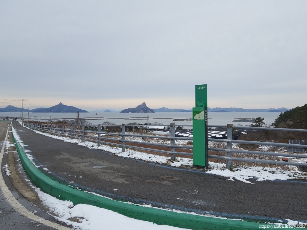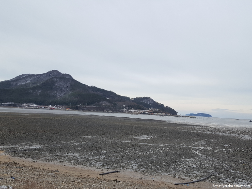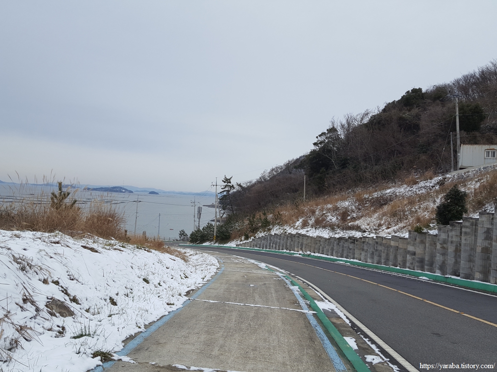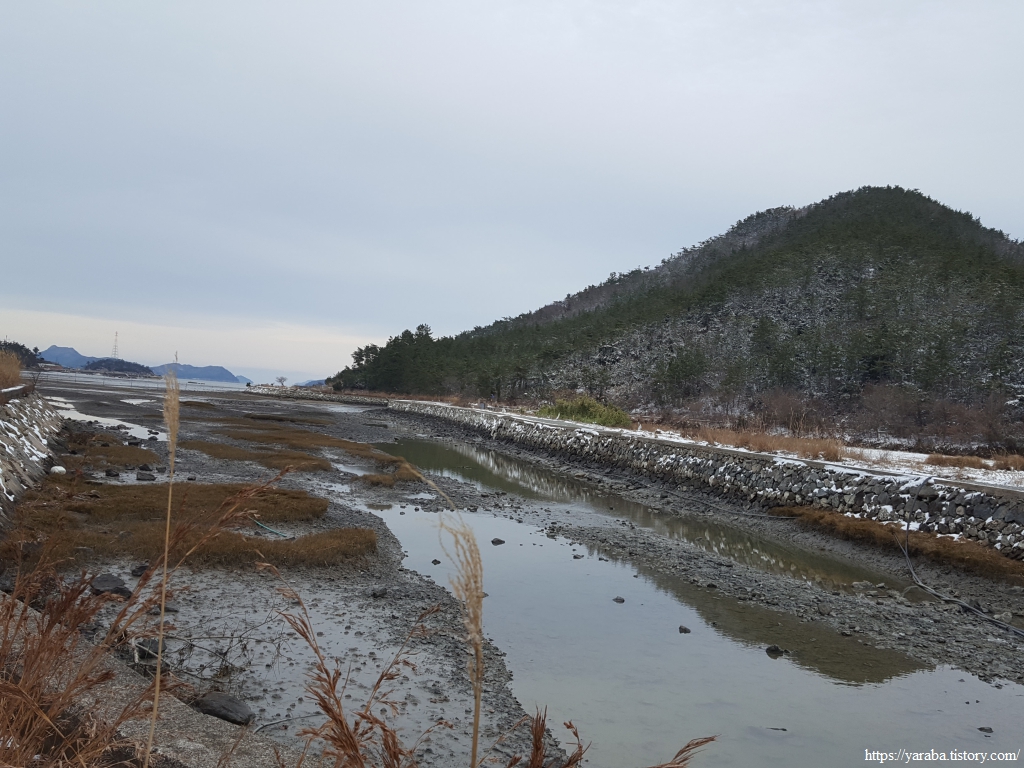 눈 녹은 물로 만들어진 웅덩이를 조심스레 피하며 방조제 둑방길을 걸어간다.