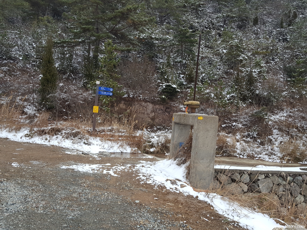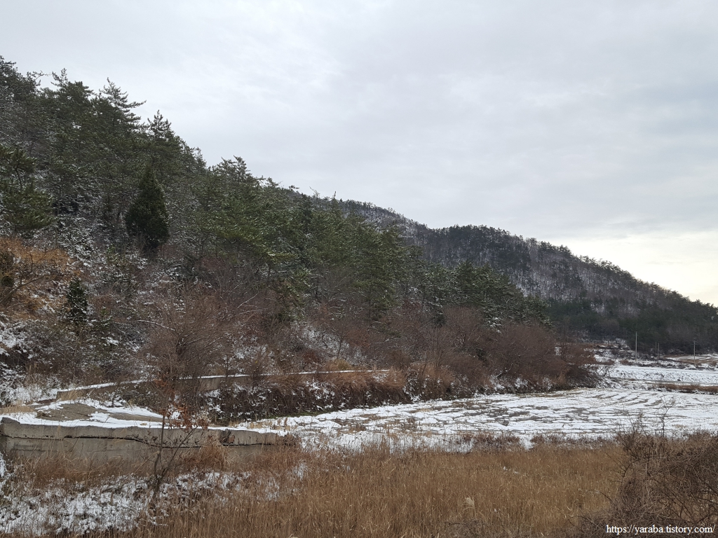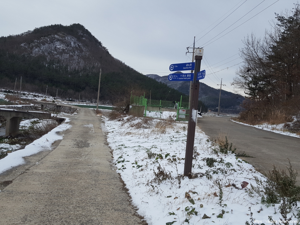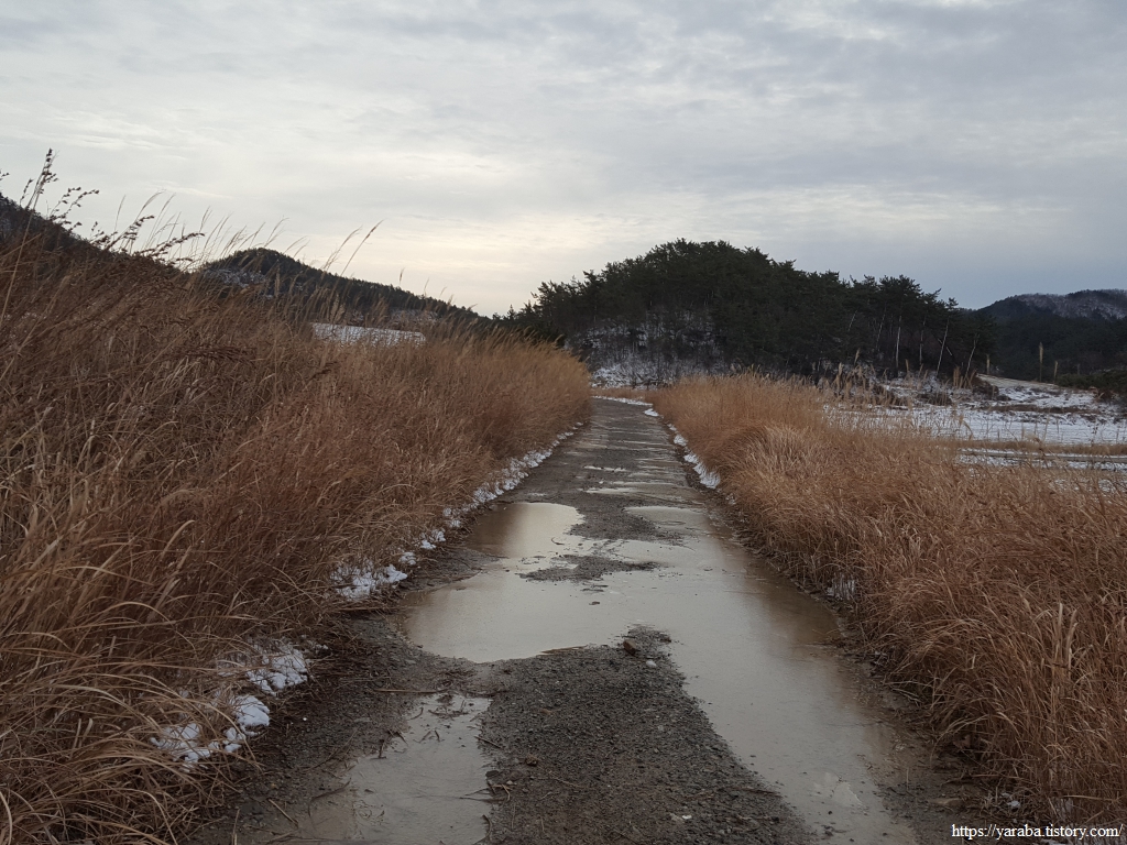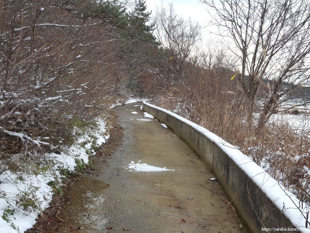 수로를 건너온 길은 검망산 동쪽 아랫자락으로 이어진 길을 따라 금노마을로 향한다. 우측사진처럼 수로의 둑이 있는 특이한 길이었는데 실제로 길이 약간 경사가 있어서 눈 녹은 물은 산 쪽으로 졸졸졸 흘러가고 있었다. 비가 많이 온다면 이곳은 길이 아니라 수로의 역할을 하지 않을까 싶다. 하나의 길로 수로와 농로 역할을 모두 하는 독특한 길이다.
