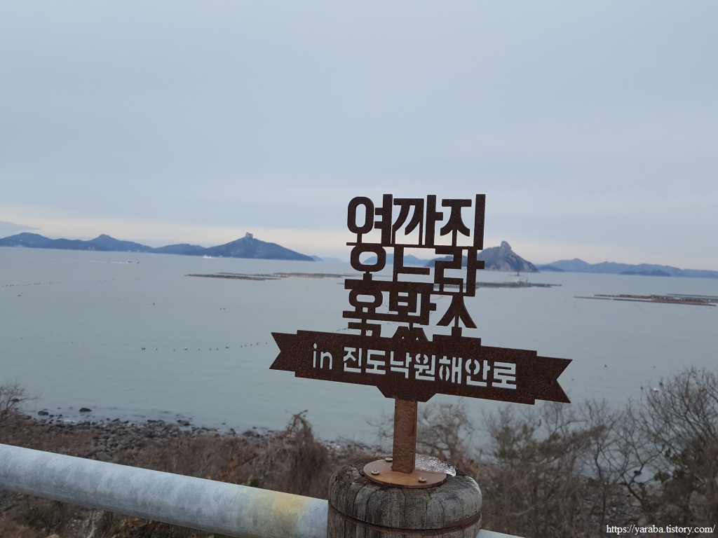 다도해 바다를 배경으로 서 있는 "여까지 오느라 욕봤소" 조형물에 빙그레 미소 지어 본다.