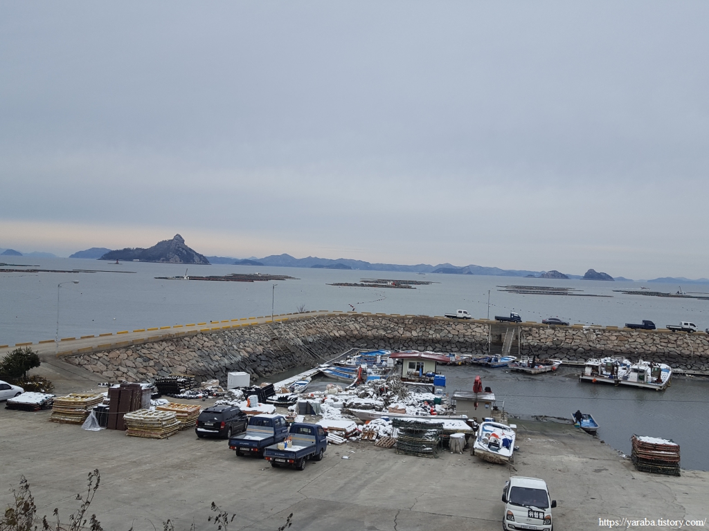 물 빠진 해안선 너머로 세방선착장이 보이고 금노항 방면으로는 빼쪽산 자락의 암봉이 자태를 뽐낸다.