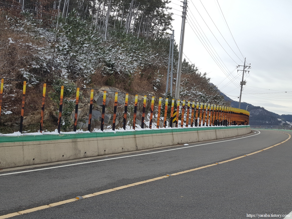 도로 곡선 부분에 독특한 볼거리가 있었는데 철판 양쪽에 서로 다른 조각 그림을 붙여서 한쪽에서는 이곳의 아침 풍경을 다른 쪽에서는 환상적인 낙조 풍경을 볼 수 있었다. 곡선 구간을 제대로 활용한 구조물이었다.
