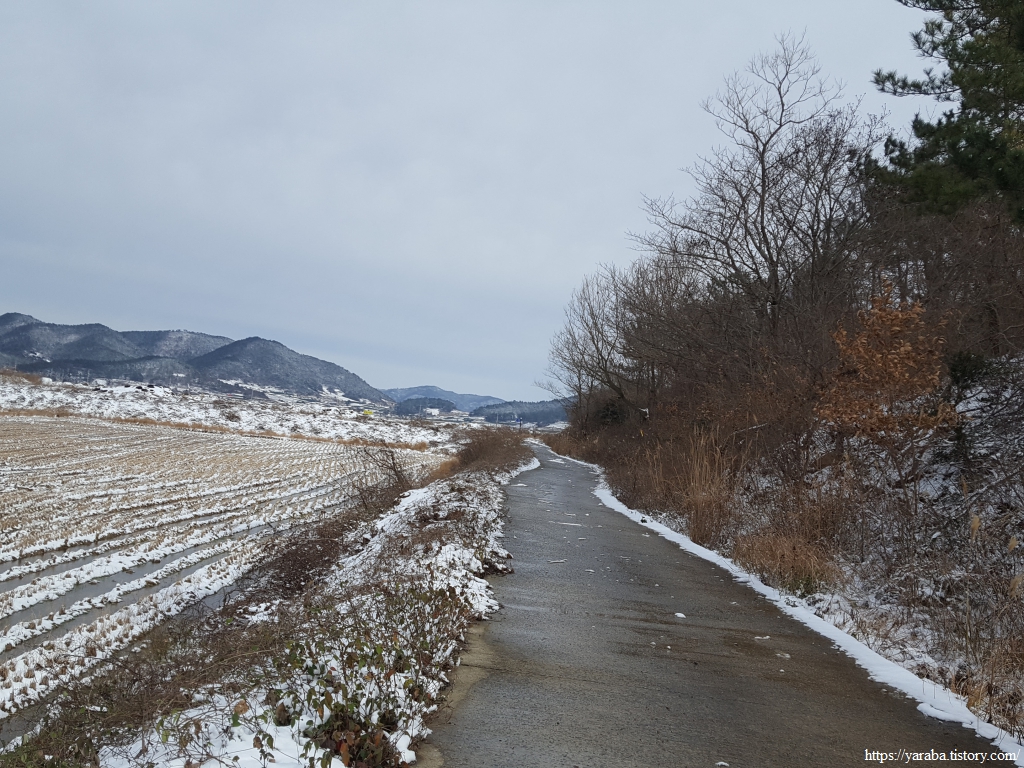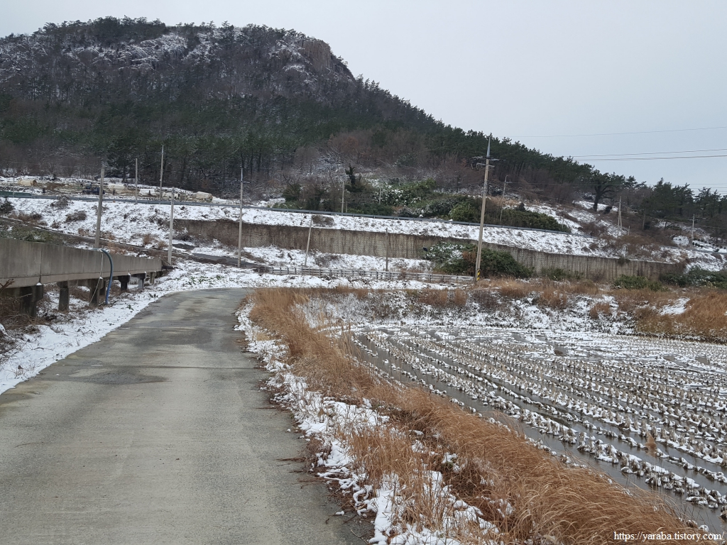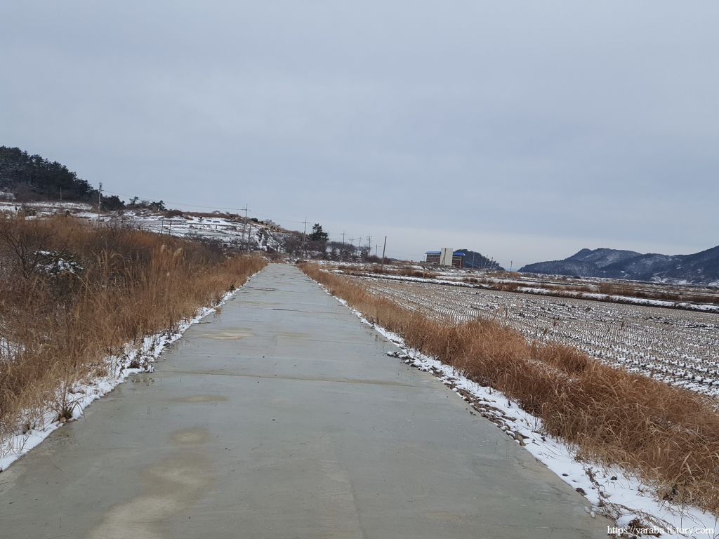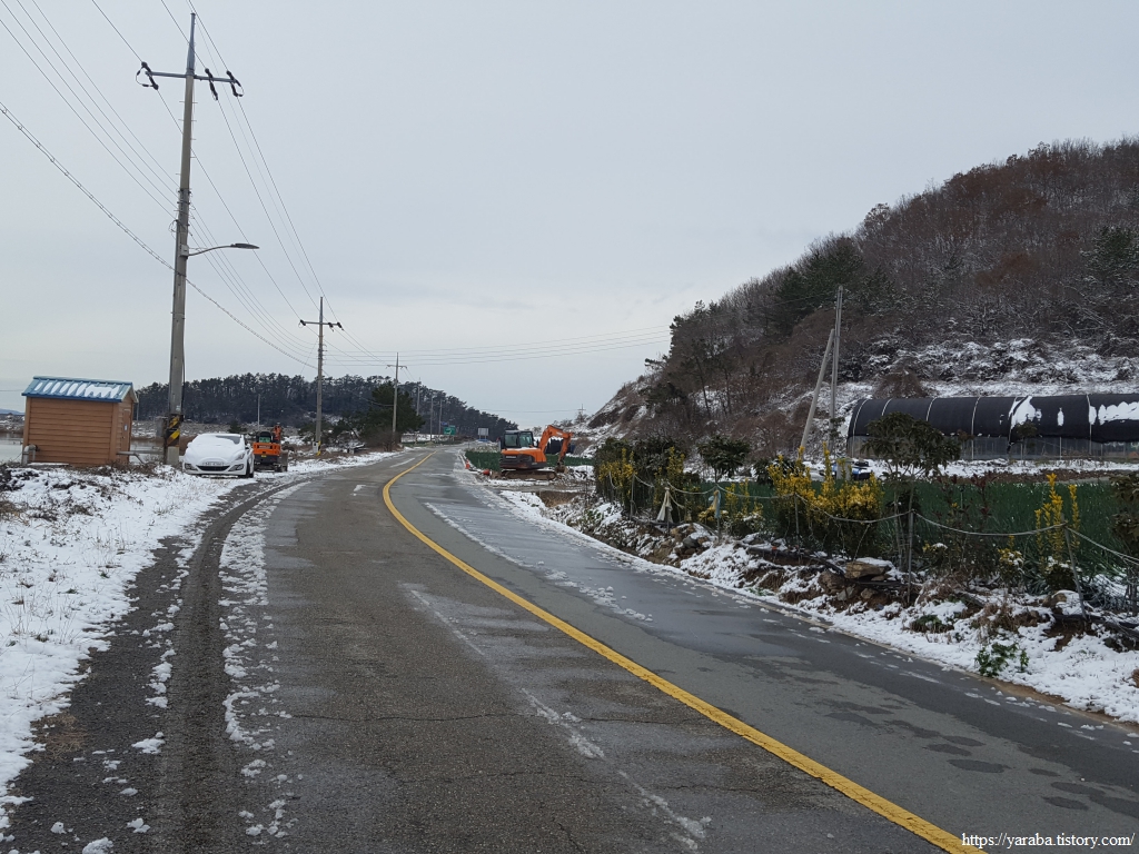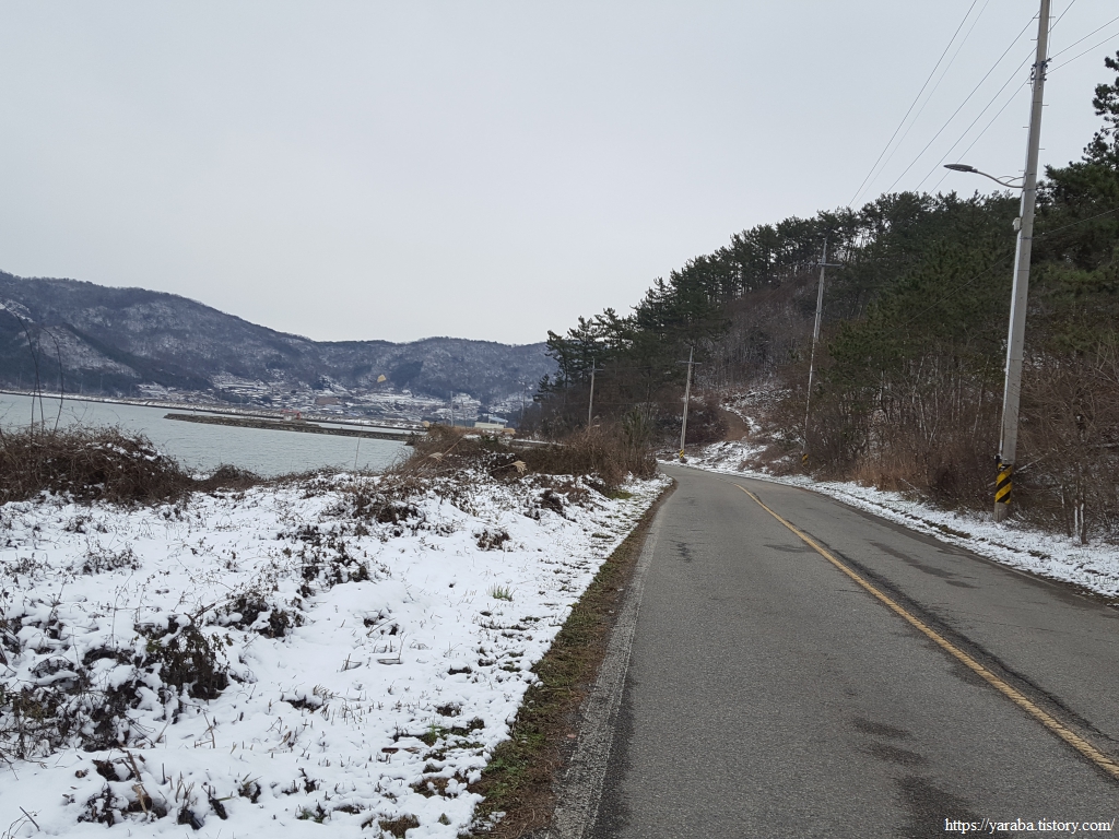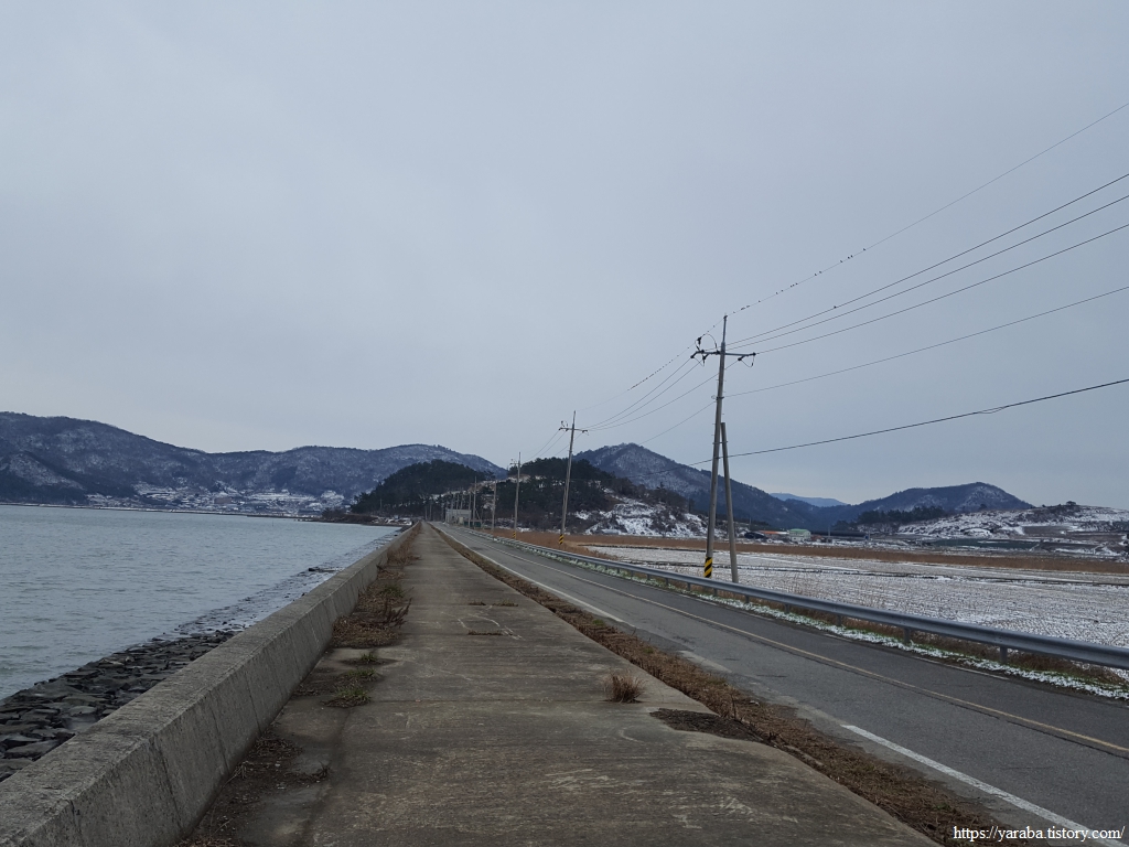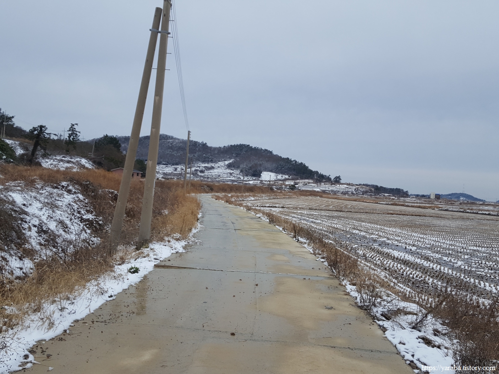 금노마을에서 잠시 휴식을 취했던 우리는 이후로는 휴식을 취할 수 있는 마땅한 곳을 찾지 못했다. 해안도로는 넓은 인도가 있어서 걷기에는 참 좋았지만 걷다가 쉴만한 공간이 없었다. 하보전마을에 오면 조금 쉴 수 있지 않을까 하는 기대를 했는데, 그 기대 또한 빗나갔다. 그늘진 응달은 눈이 녹지 않았고, 눈이 녹고 있는 곳은 물이 가득하고, 싸늘한 바람까지 불고 있으니, 부질없지만 평소에는 가지도 않는 비싼 커피를 파는 카페라도 있으면 좋겠다 하는 생각도 했다. 결국 배고픈 옆지기를 위한 휴식처를 찾지 못했으니, 이번에는 들길을 걸어가면서 김밥을 먹기로 했다. 쉴 곳이 없으니 걸어가면서 김밥 먹기라도 해야 옆지기의 허기를 달랠 수 있었다.