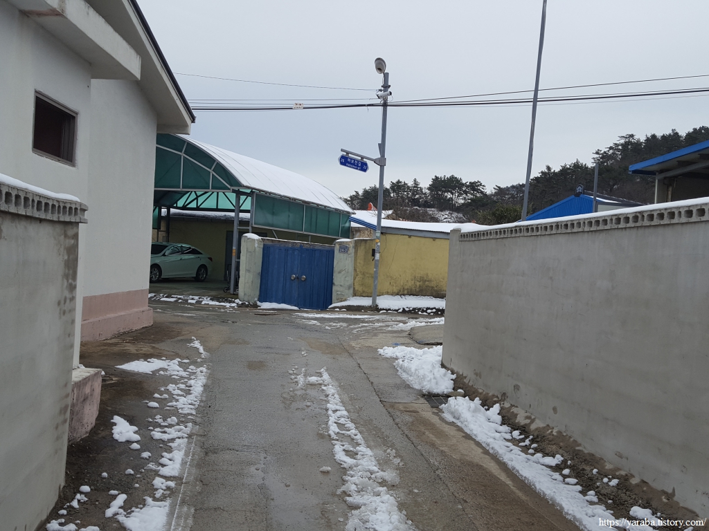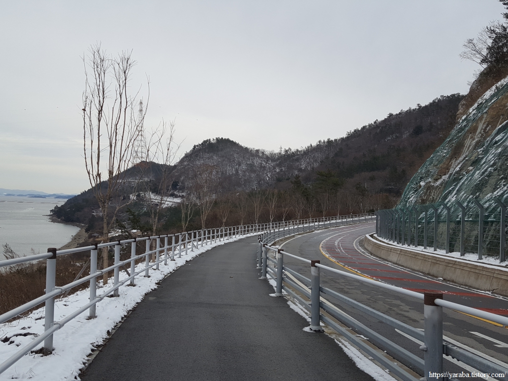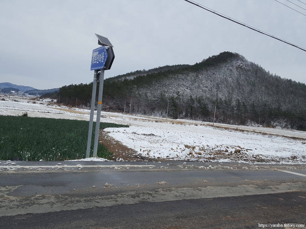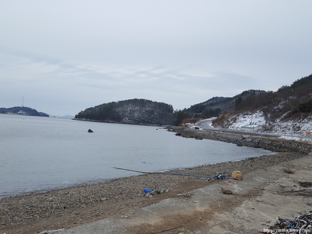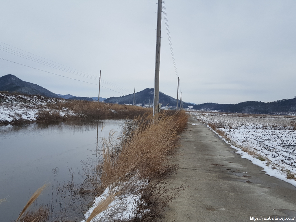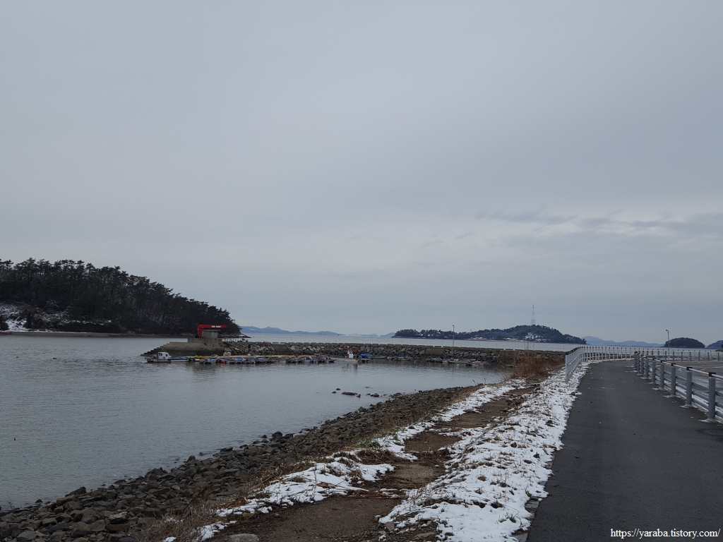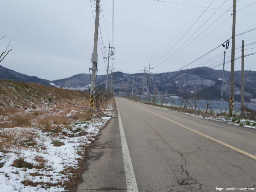 금노마을에서 잠시 휴식을 취했던 우리는 이후로는 휴식을 취할 수 있는 마땅한 곳을 찾지 못했다. 해안도로는 넓은 인도가 있어서 걷기에는 참 좋았지만 걷다가 쉴만한 공간이 없었다. 하보전마을에 오면 조금 쉴 수 있지 않을까 하는 기대를 했는데, 그 기대 또한 빗나갔다. 그늘진 응달은 눈이 녹지 않았고, 눈이 녹고 있는 곳은 물이 가득하고, 싸늘한 바람까지 불고 있으니, 부질없지만 평소에는 가지도 않는 비싼 커피를 파는 카페라도 있으면 좋겠다 하는 생각도 했다. 결국 배고픈 옆지기를 위한 휴식처를 찾지 못했으니, 이번에는 들길을 걸어가면서 김밥을 먹기로 했다. 쉴 곳이 없으니 걸어가면서 김밥 먹기라도 해야 옆지기의 허기를 달랠 수 있었다.