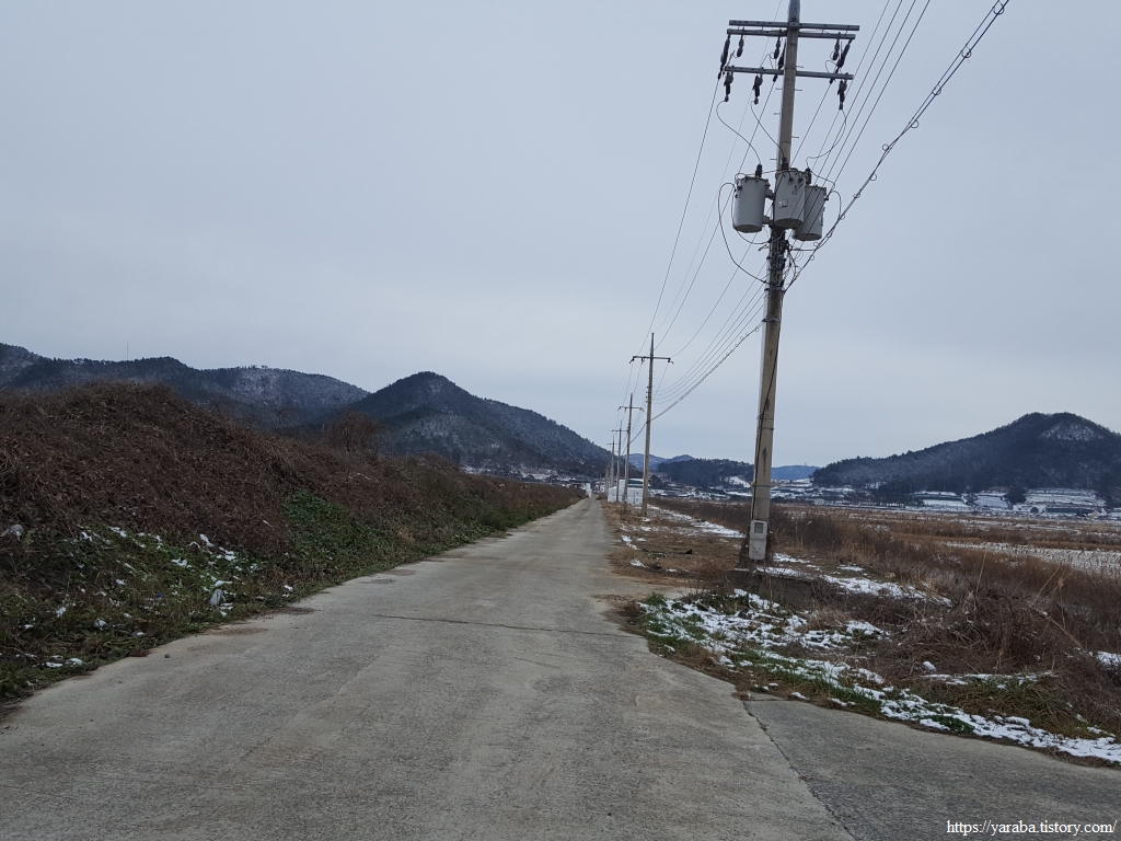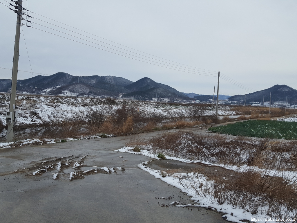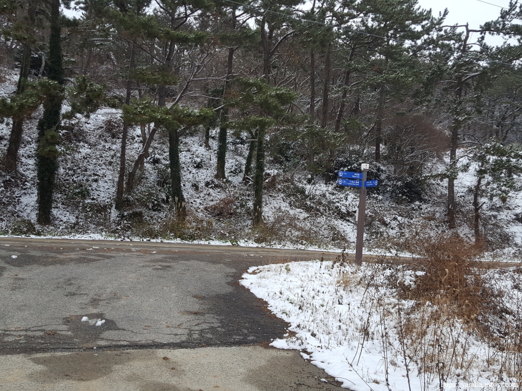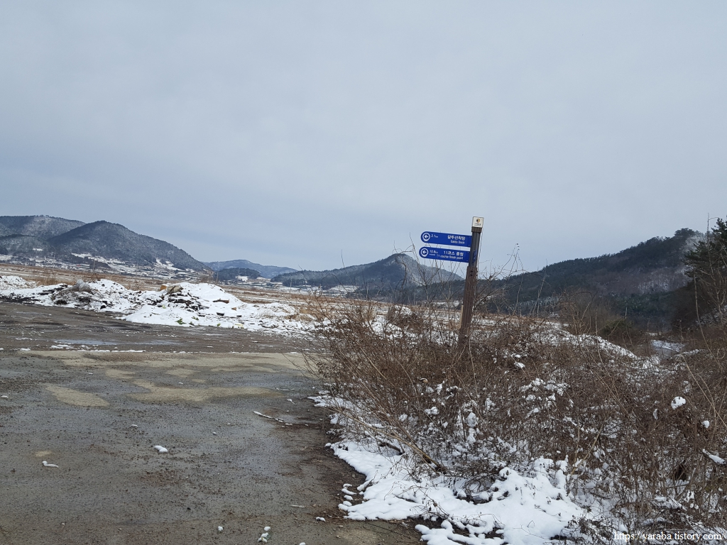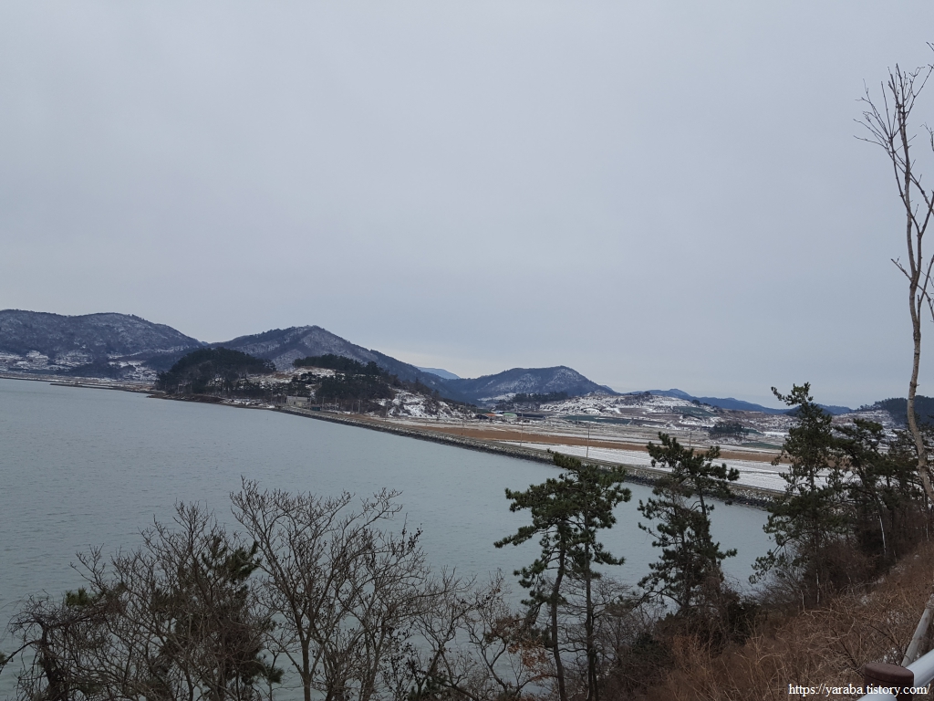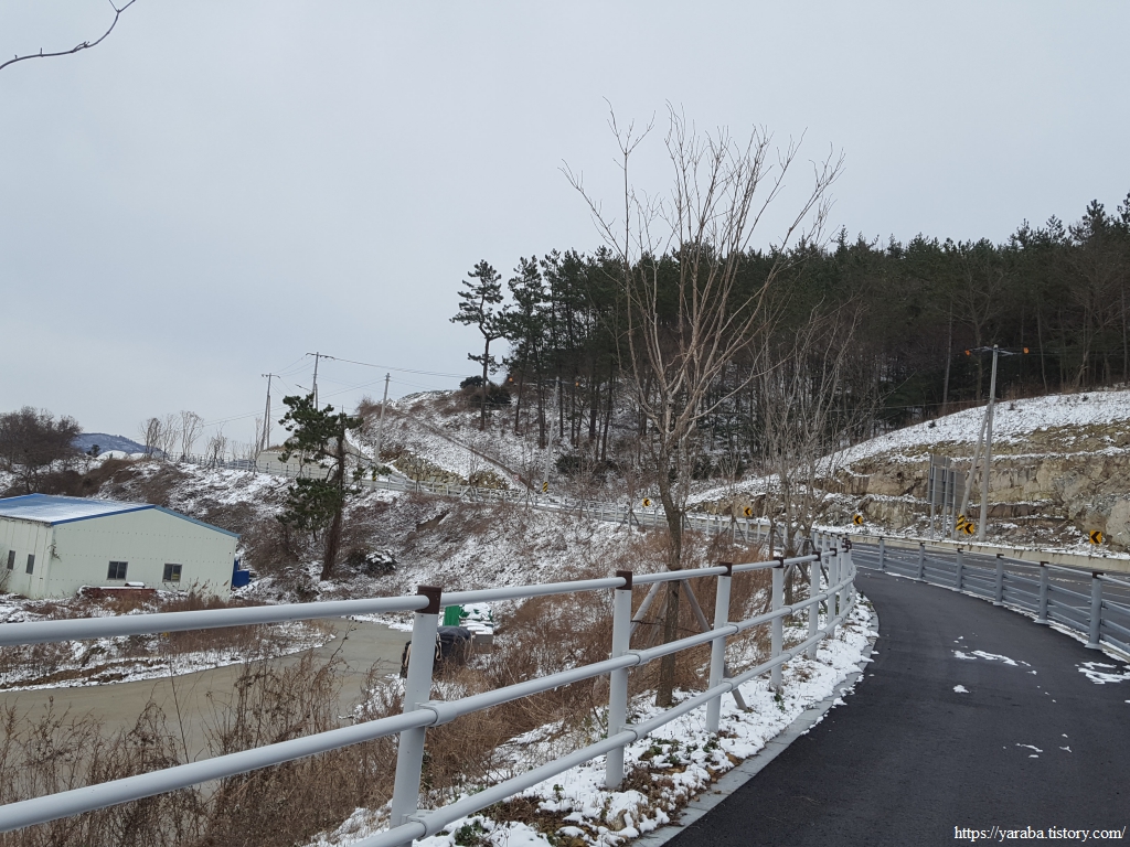 금노마을에서 잠시 휴식을 취했던 우리는 이후로는 휴식을 취할 수 있는 마땅한 곳을 찾지 못했다. 해안도로는 넓은 인도가 있어서 걷기에는 참 좋았지만 걷다가 쉴만한 공간이 없었다. 하보전마을에 오면 조금 쉴 수 있지 않을까 하는 기대를 했는데, 그 기대 또한 빗나갔다. 그늘진 응달은 눈이 녹지 않았고, 눈이 녹고 있는 곳은 물이 가득하고, 싸늘한 바람까지 불고 있으니, 부질없지만 평소에는 가지도 않는 비싼 커피를 파는 카페라도 있으면 좋겠다 하는 생각도 했다. 결국 배고픈 옆지기를 위한 휴식처를 찾지 못했으니, 이번에는 들길을 걸어가면서 김밥을 먹기로 했다. 쉴 곳이 없으니 걸어가면서 김밥 먹기라도 해야 옆지기의 허기를 달랠 수 있었다.