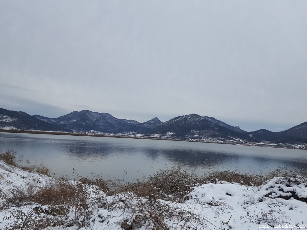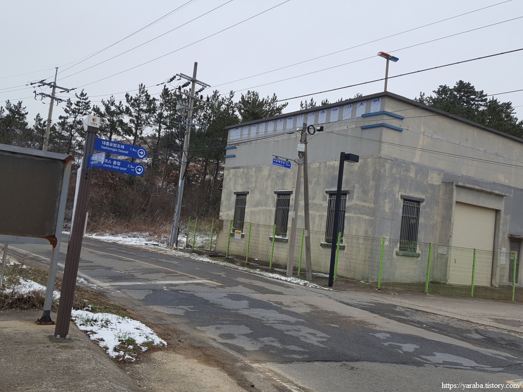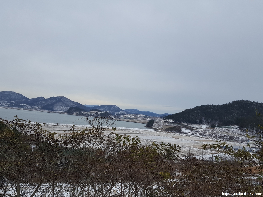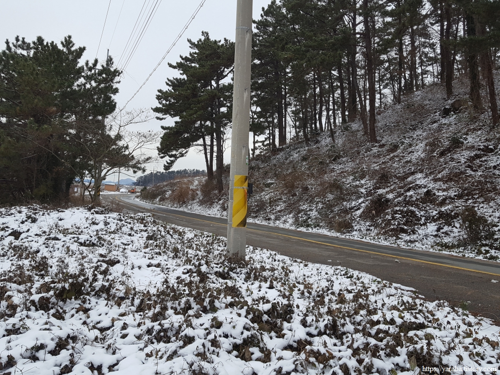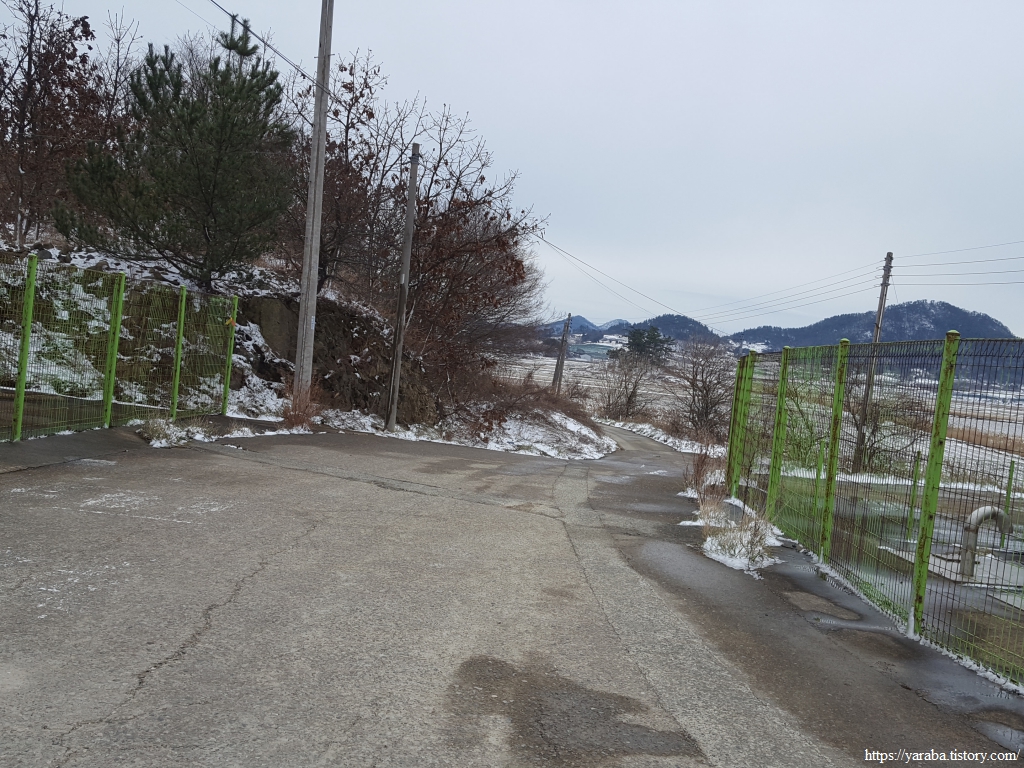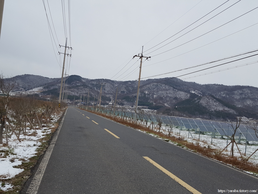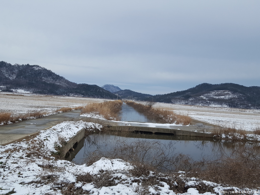 금노마을에서 잠시 휴식을 취했던 우리는 이후로는 휴식을 취할 수 있는 마땅한 곳을 찾지 못했다. 해안도로는 넓은 인도가 있어서 걷기에는 참 좋았지만 걷다가 쉴만한 공간이 없었다. 하보전마을에 오면 조금 쉴 수 있지 않을까 하는 기대를 했는데, 그 기대 또한 빗나갔다. 그늘진 응달은 눈이 녹지 않았고, 눈이 녹고 있는 곳은 물이 가득하고, 싸늘한 바람까지 불고 있으니, 부질없지만 평소에는 가지도 않는 비싼 커피를 파는 카페라도 있으면 좋겠다 하는 생각도 했다. 결국 배고픈 옆지기를 위한 휴식처를 찾지 못했으니, 이번에는 들길을 걸어가면서 김밥을 먹기로 했다. 쉴 곳이 없으니 걸어가면서 김밥 먹기라도 해야 옆지기의 허기를 달랠 수 있었다.