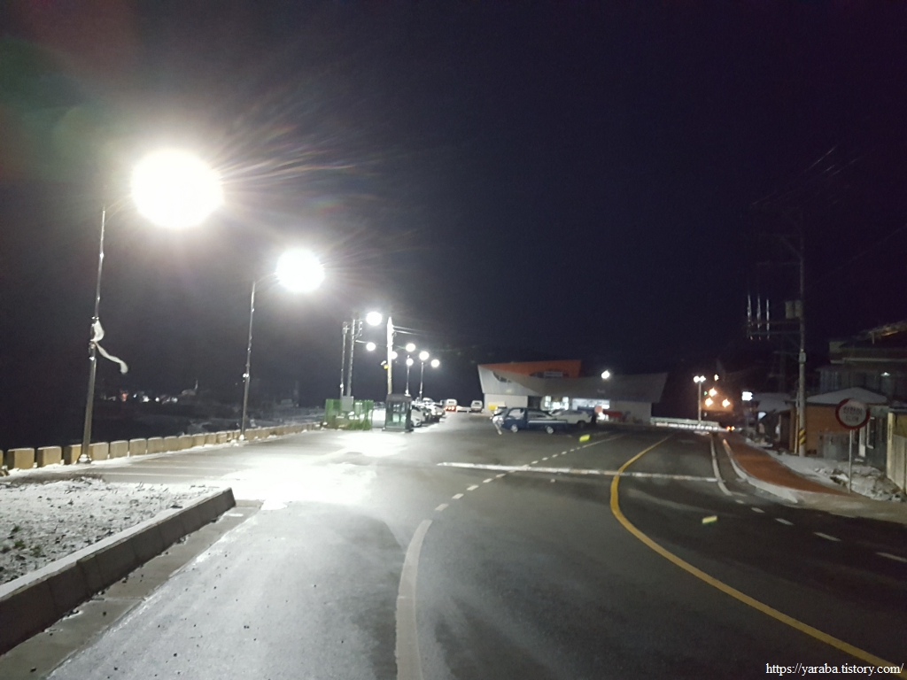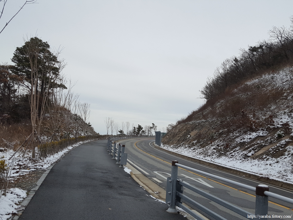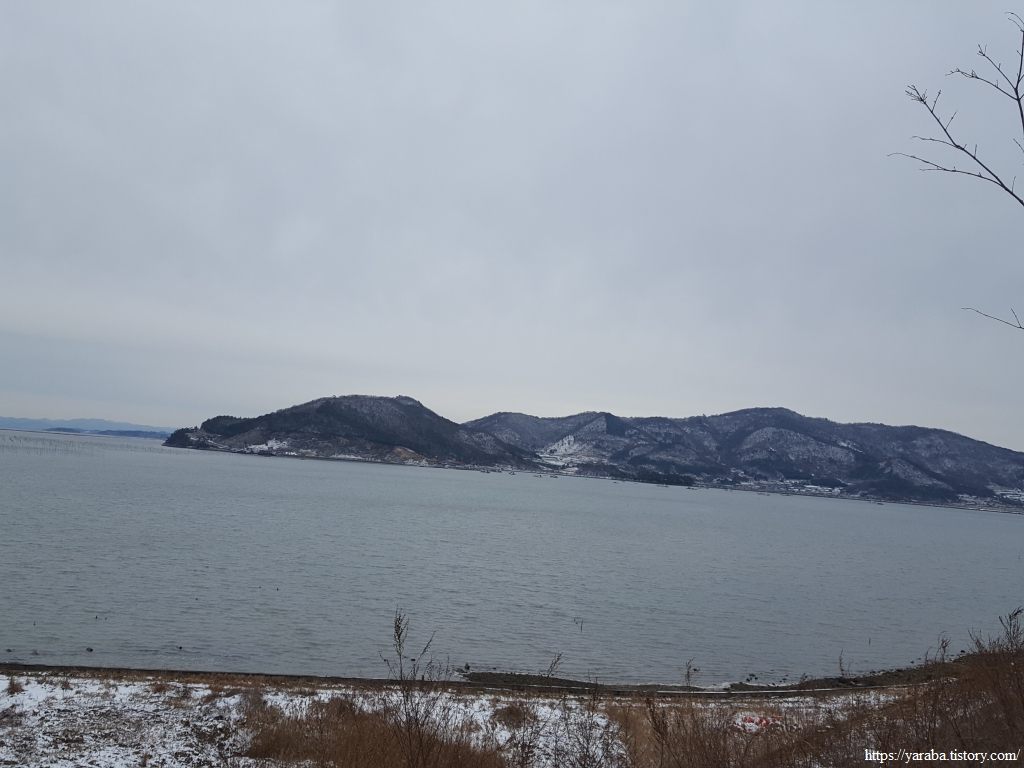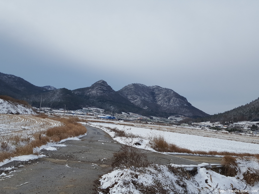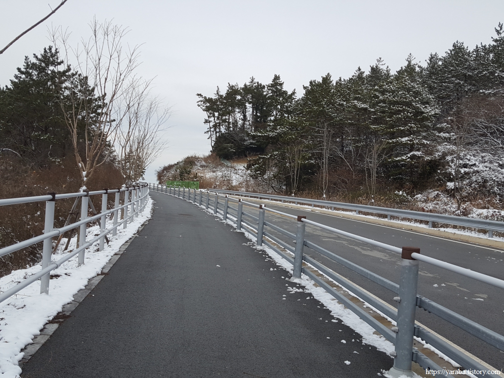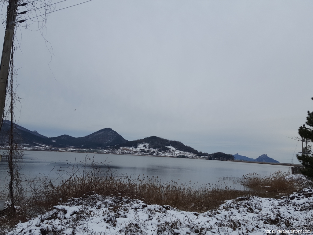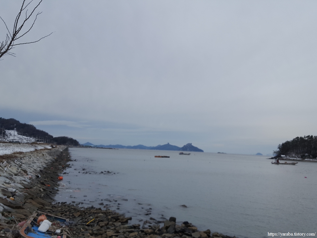 금노마을에서 잠시 휴식을 취했던 우리는 이후로는 휴식을 취할 수 있는 마땅한 곳을 찾지 못했다. 해안도로는 넓은 인도가 있어서 걷기에는 참 좋았지만 걷다가 쉴만한 공간이 없었다. 하보전마을에 오면 조금 쉴 수 있지 않을까 하는 기대를 했는데, 그 기대 또한 빗나갔다. 그늘진 응달은 눈이 녹지 않았고, 눈이 녹고 있는 곳은 물이 가득하고, 싸늘한 바람까지 불고 있으니, 부질없지만 평소에는 가지도 않는 비싼 커피를 파는 카페라도 있으면 좋겠다 하는 생각도 했다. 결국 배고픈 옆지기를 위한 휴식처를 찾지 못했으니, 이번에는 들길을 걸어가면서 김밥을 먹기로 했다. 쉴 곳이 없으니 걸어가면서 김밥 먹기라도 해야 옆지기의 허기를 달랠 수 있었다.