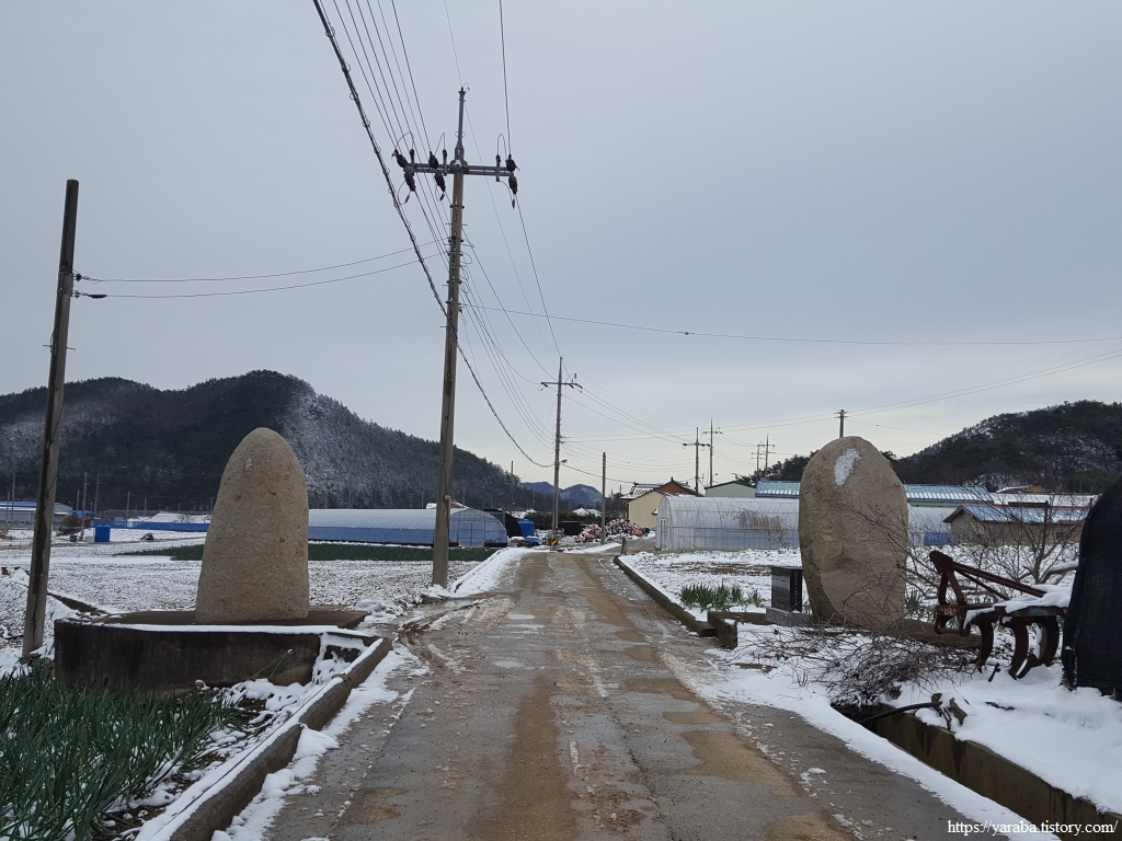 하보전리 입구에 세워진 선돌을 지나 마을 안으로 들어간다. 선돌은 고인돌과 함께 대표적인 거석문화의 하나인데, 하보전 마을에도 오래전부터 내려오는 선돌이 있고 사진에서 보이는 선돌은 후대가 새롭게 세운 선돌이다.