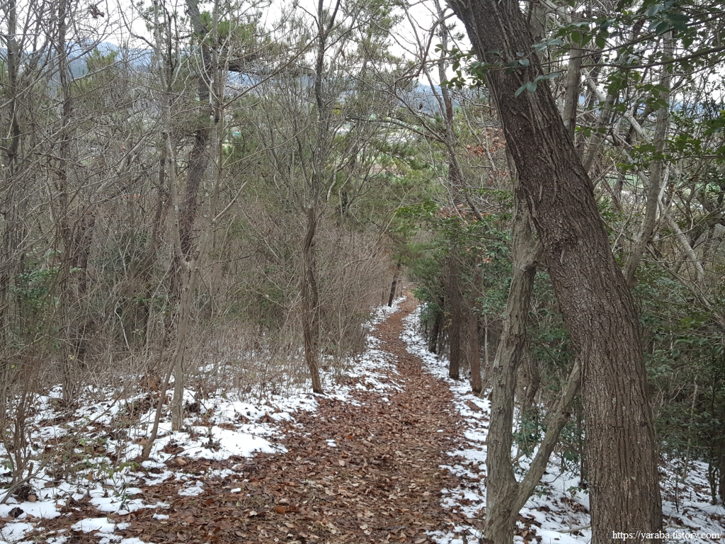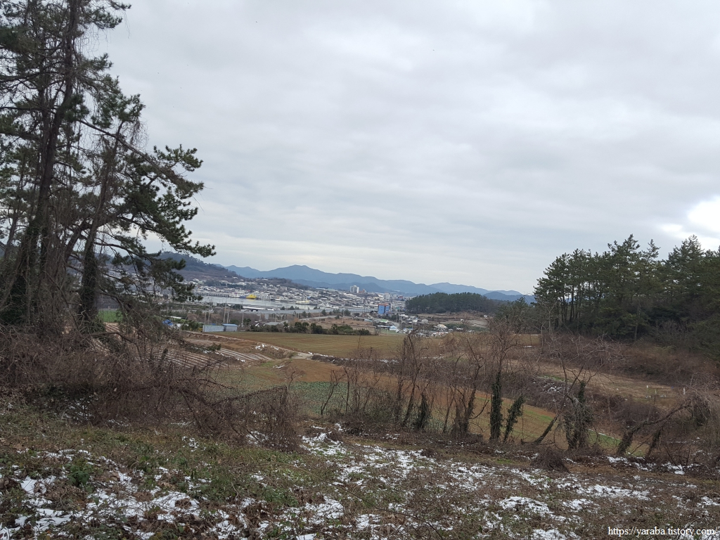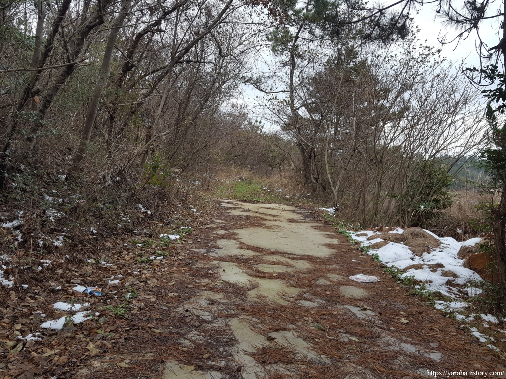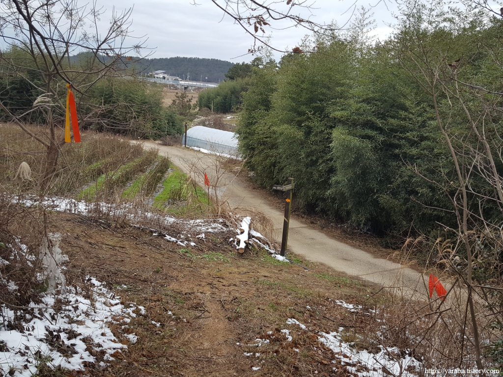 청룡산 정상으로 향하는 능선길에서 북쪽으로는 우수영마을이 시야에 들어오기 시작한다. 낮은 산이기는 하지만 평지보다는 온도가 낮은 까닭인지 이곳에는 눈이 여전하다.