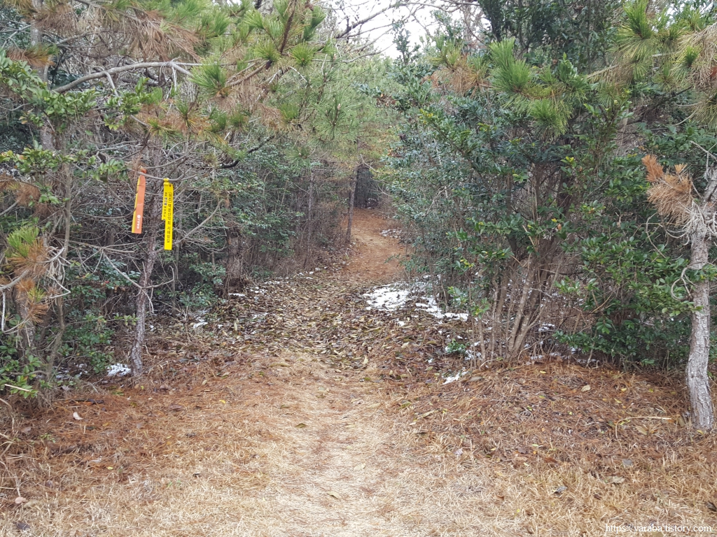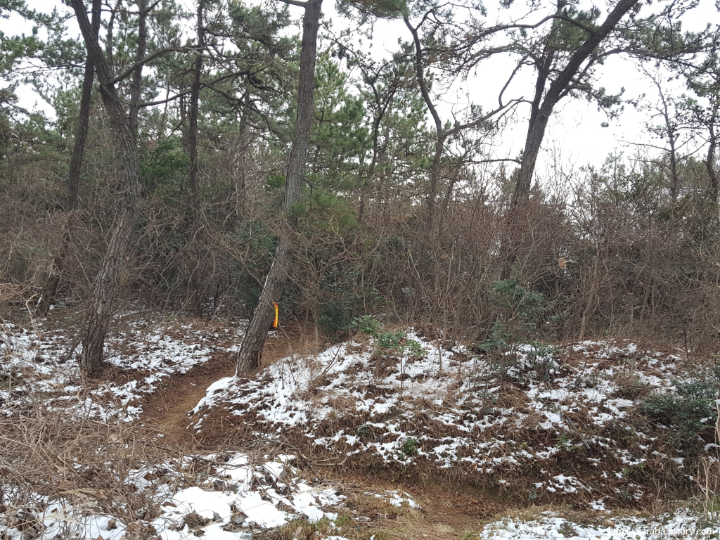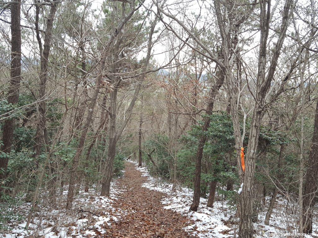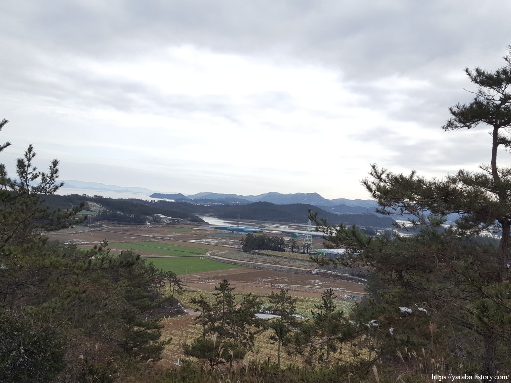 청룡산 정상으로 향하는 능선길에서 북쪽으로는 우수영마을이 시야에 들어오기 시작한다. 낮은 산이기는 하지만 평지보다는 온도가 낮은 까닭인지 이곳에는 눈이 여전하다.