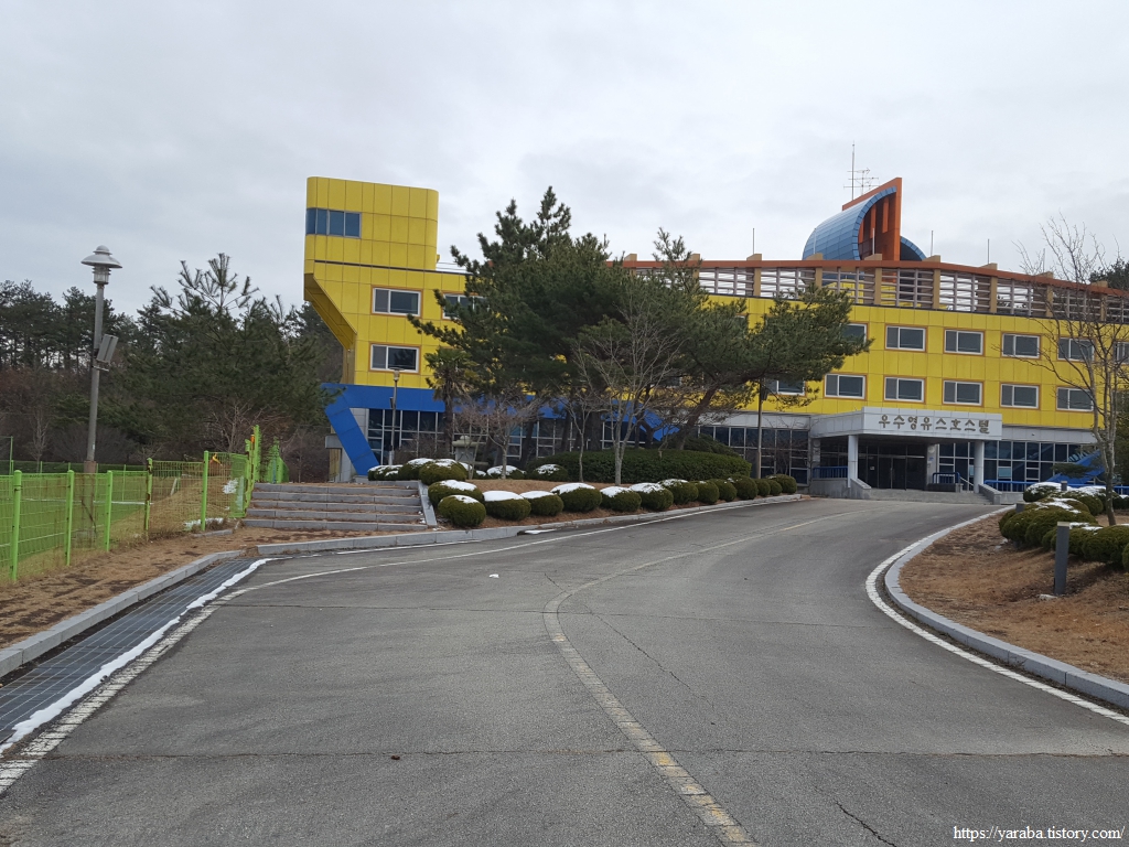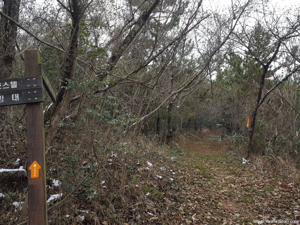 강강술래기념비 앞에서 시작하는 서해랑길 13코스는 도로를 따라 올라가다가 우회전하여 우수영 유스호스텔 측면의 샛길을 통해 건물 뒤쪽으로 이동한다.