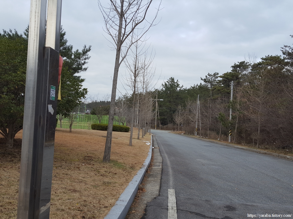 우수영 유스호스텔 건물 뒤쪽으로 도로로 나오면 전망대 방면 표식을 따라 좌회전하여 도로를 걷다가 안골길 삼거리에서 우측 오르막길로 우회전하여 오르막길을 오르기 시작한다.