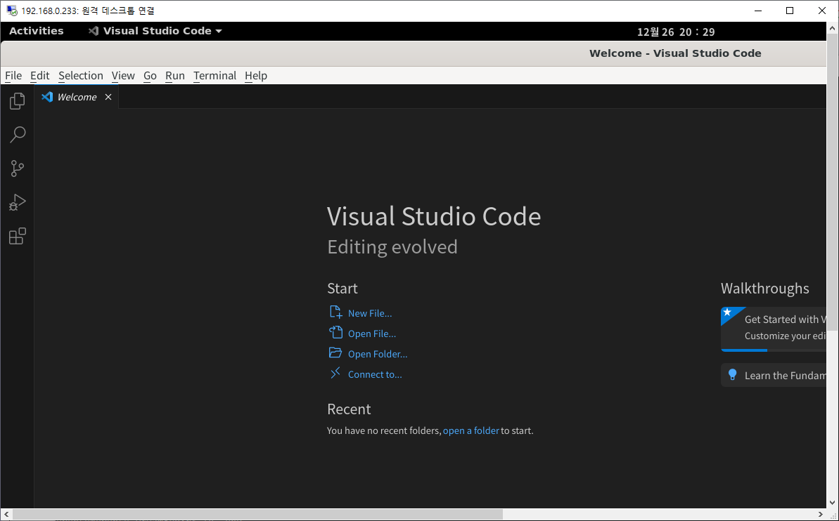 위의 그림은 원격데스크톱으로 연결하여 우분투에서 비주얼스튜디오 코드를 실행한 화면이다.