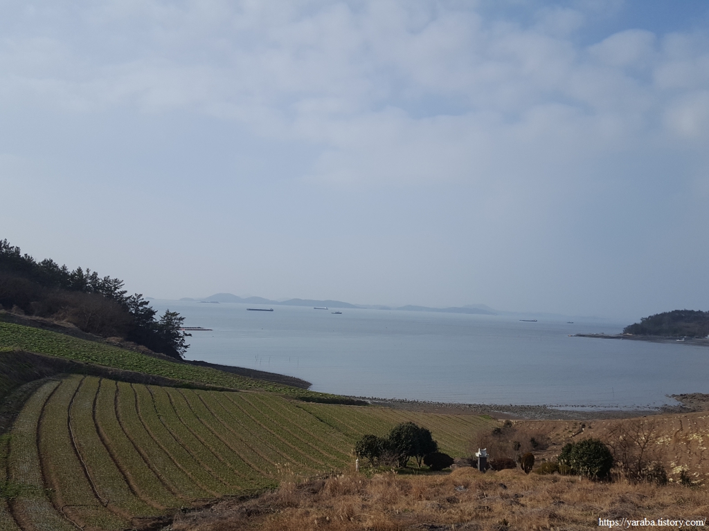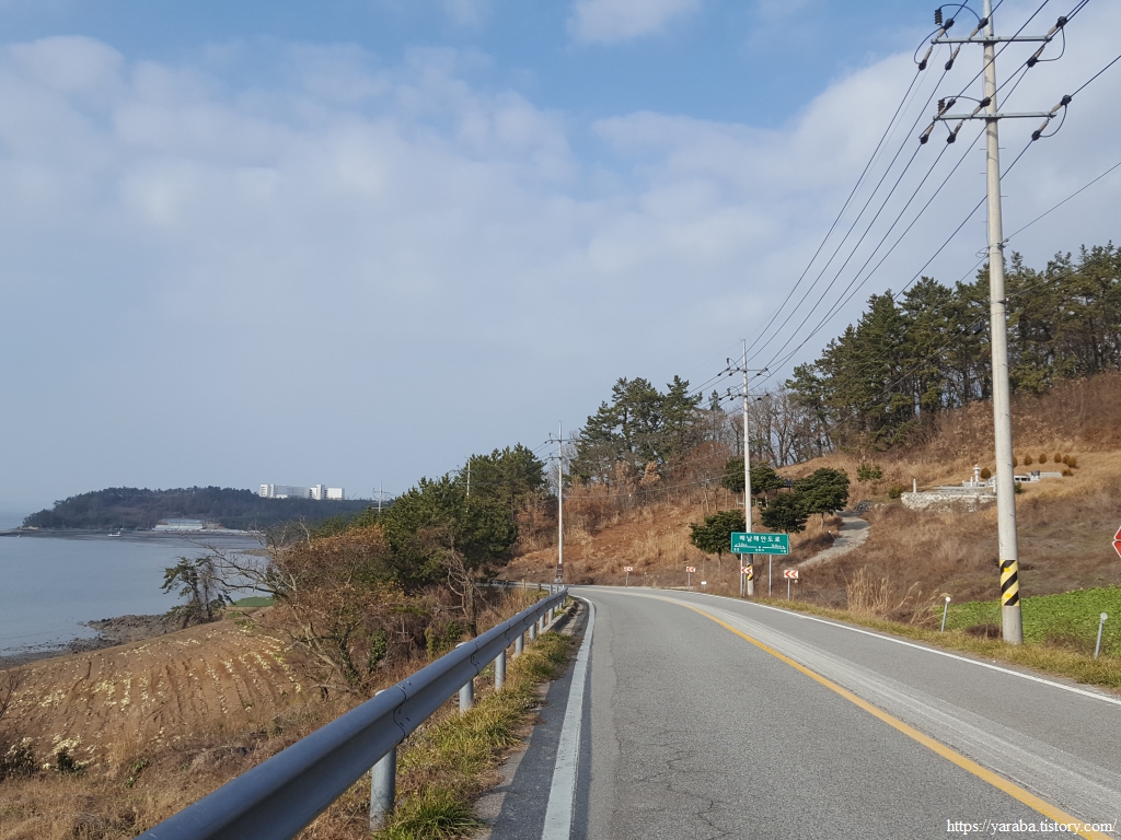 해안선을 보면서 북쪽으로 계속 도로를 걷는다. 바로 앞으로는 작은 섬 우도가 살짝 보이고 멀리로는 신안군에 속한 섬들이다.