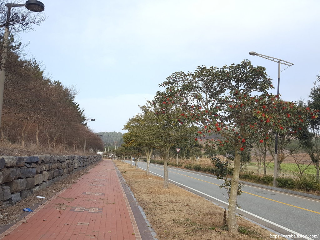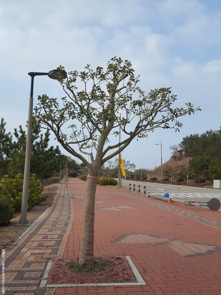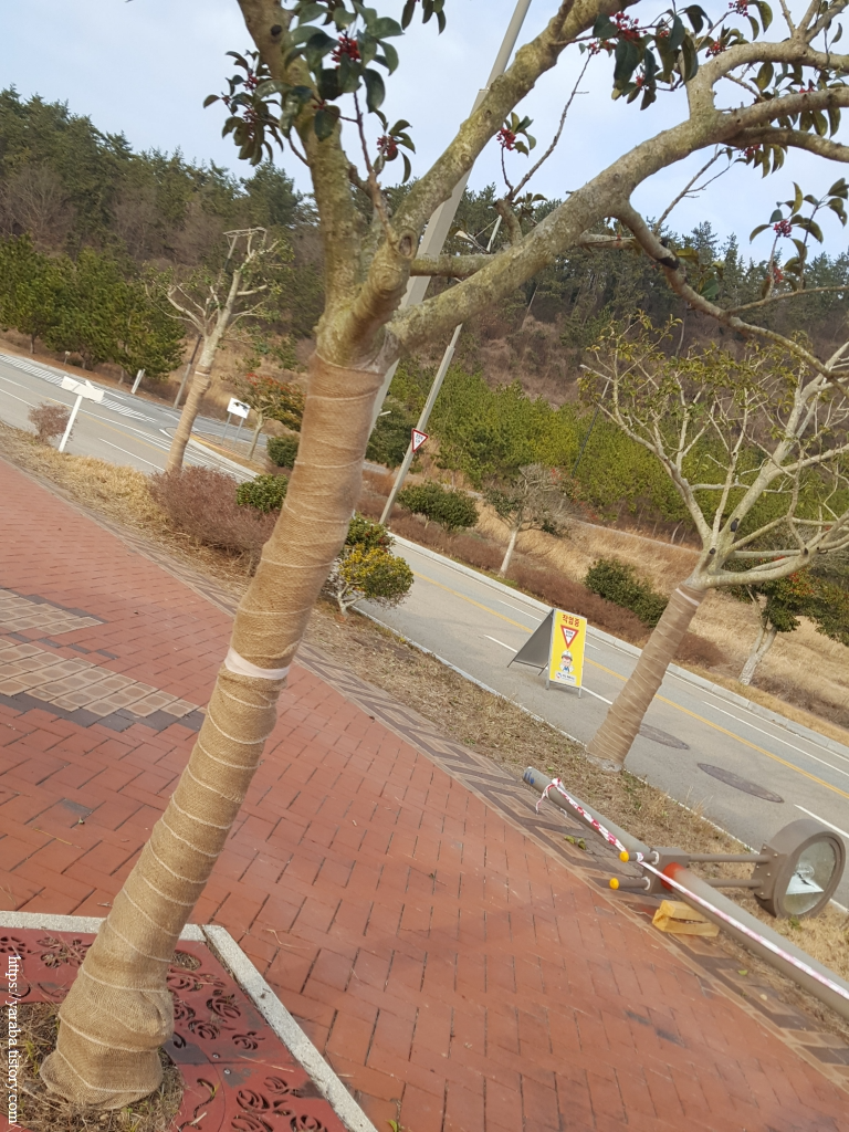관광단지 벤치에서 잠시 쉬었다가 길을 이어가는데 가로수의 겨울나기 준비가 한창이었다. 한 팀은 나무 가치 치기를 담당하고 뒤따라 가는 분은 삼베로 만든 트리 랩으로 나무를 감싸주고 계셨다. 한참 일하고 계신 분에게 이렇게 따뜻한 남부 지방에서도 나무를 싸매 주어야 하나요? 하는 질문 했더니 바다의 염분이 찬바람과 함께 나무를 때리면 나무가 상처를 입는다고 한다. 가지치기한 부분에 검은 액체도 바르고 있었는데 상처보호 도포제라고 친절하게 알려 주셨다. 걸으면 많은 것을 자연스레 배우게 된다.