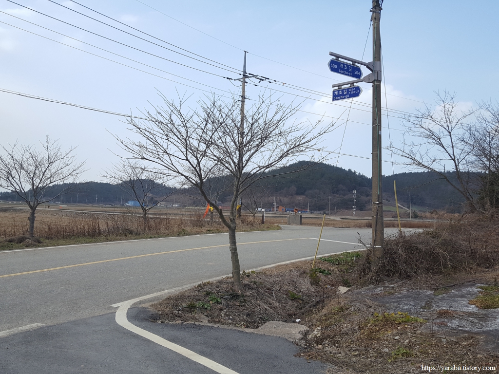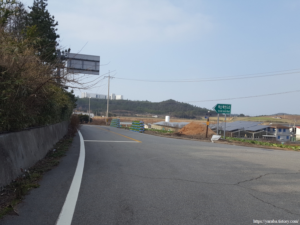 우수영로 도로로 나온 길은 오시아노관광단지까지 계속 도로를 따라 북쪽으로 이동한다. 수확이 끝난 양배추밭 너머로는 외국인 노동자들이 봄동을 수확하느라 왁자지껄하다. 시끌시끌한 소리에 한국말은 한마디도 없다. 4계절 내내 우리의 농촌에는 외국인 근로자가 없으면 움직일 수가 없는 것이 현실이다.