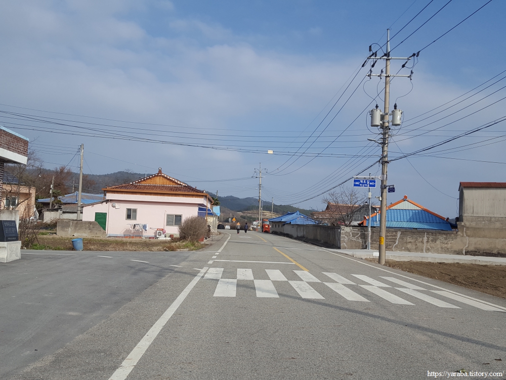 13코스에 이어서 14코스 일부를 걷는 일정에서 들판에서는 날도 춥고 바람이 많이 불어서 쉴만한 적당한 장소가 없었다. 결국 학상마을 마을 회관 옆 계단에 쭈그리고 앉아 잠시 쉬어 간다. 화원면에서 만나는 첫 마을이다. 학상마을도 일제강점기 간척 사업의 결과로 만들어진 곳이다.