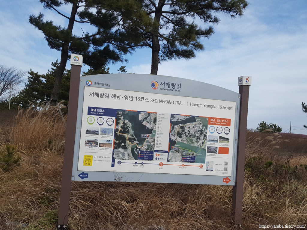 당포마을에서 시작하는 서해랑길 15코스는 화원 반도를 벗어나 해남군 산이면으로 들어간다. 당포를 출발하면 당포마을 앞의 월하마을을 관통하여 77번 국도로 나가고 도로를 통해 진등산 자락의 고개를 넘는다. 원래의 길은 도로를 벗어나서 마천마을과 마산제 저수지를 거쳐 다시 도로로 올라오는 것이지만 중간에 마을로 내려가는 표식을 놓쳐서 그냥 도로를 계속 걸었다. 우리는 그냥 도로를 계속 걸었지만 이곳은 국도답게 오가는 자동차가 많고 도로폭도 넓지 않아 원래의 경로대로 걷는 것이 좋다. 마천마을을 지나 해안으로 내려가면 금호갑문을 지나 금호도에 이른다. 금호도를 지나고 다시 방조제를 걸어 구성삼거리에서 여정을 마무리한다.