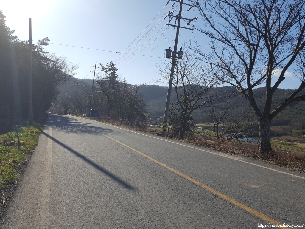 월하마을을 빠져나와 국도를 따라 걷는 길은 진등산 자락의 완만한 오르막을 오르기 시작한다. 남쪽으로 내려가는 길, 기온은 서늘하지만 아침 햇살을 받으며 걷는 이 길이 참 좋다.