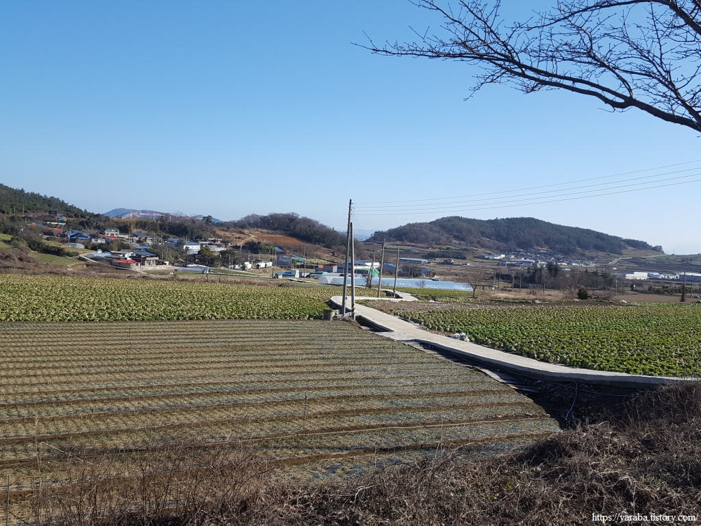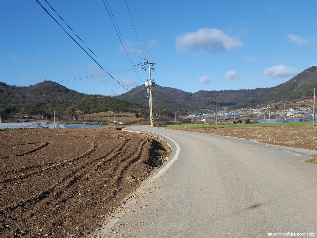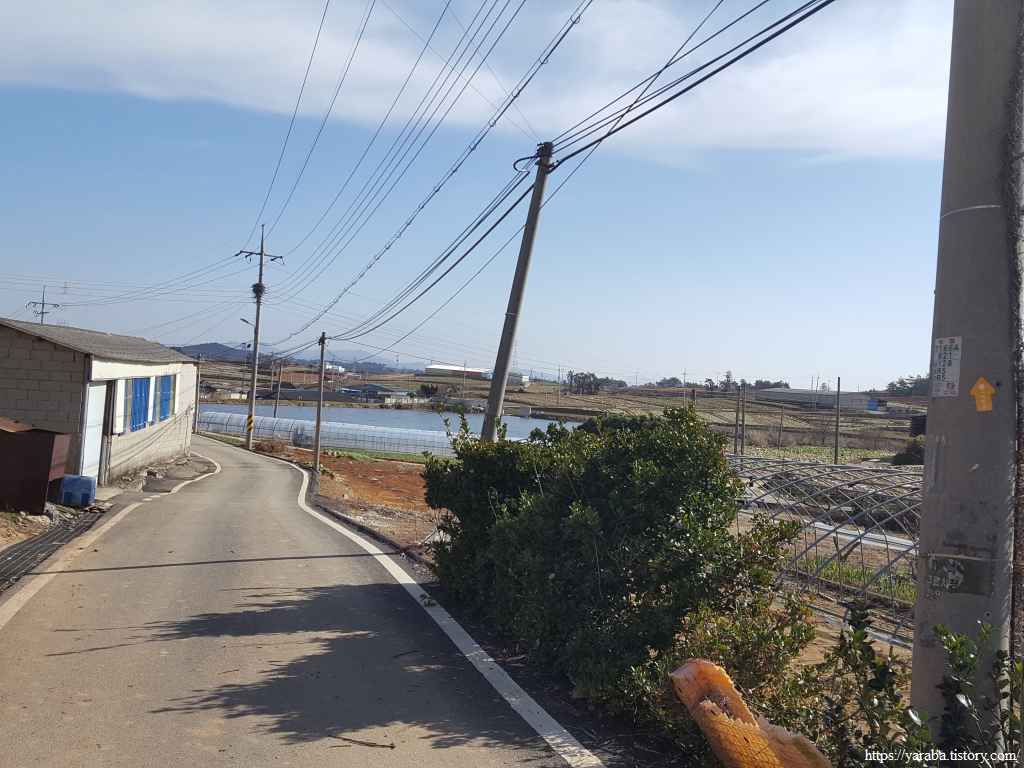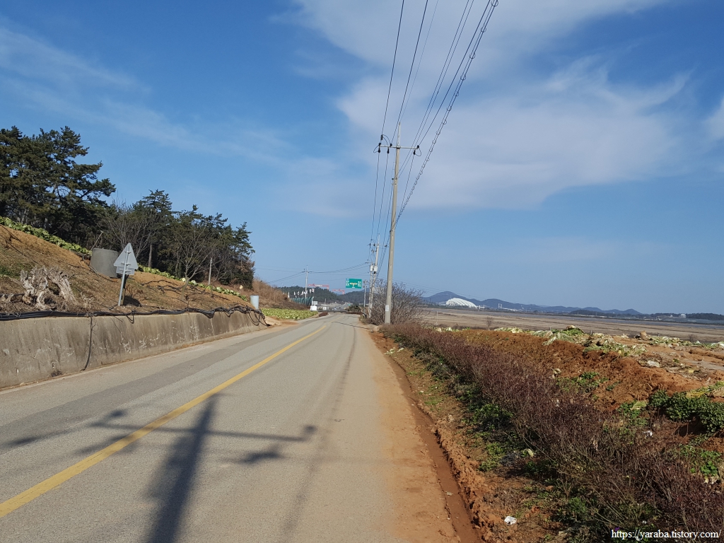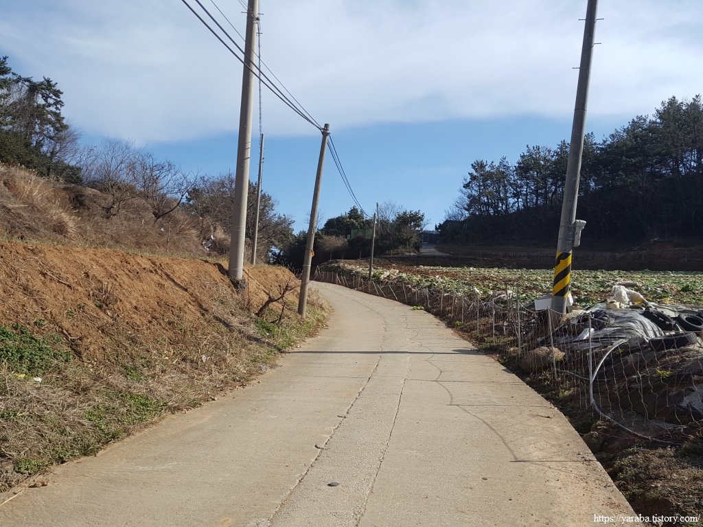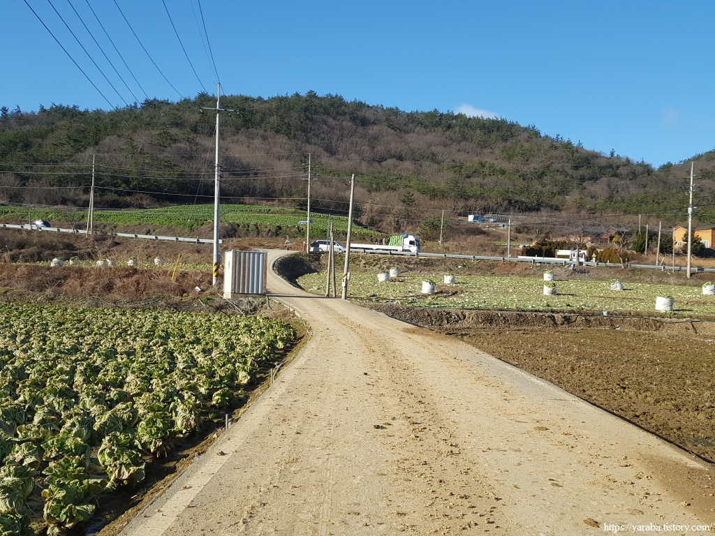 이 근방에서 원래의 서해랑길은 좌측으로 도로를 벗어나 마천마을로 가야 하지만 우리는 그만 길을 지나치고 말았다. 아마도 배추 수확 현장을 보느라 서해랑길 표식을 놓친 모양이다. 그렇지만, 어차피 마천마을을 돌아오는 서해랑길과 나중에 도로에서 합류하니 그냥 도로를 걷기로 했다. 하지만 도로도 넓지 않고 자동차가 많은 편이라 할 수만 있다면 원래의 경로로 걷는 것이 좋다.