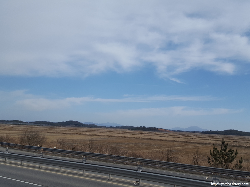 고개를 숙이고, 모자가 날아가지 않도록 단단히 붙들고 세찬 바람을 가르며 방조제 위를 걷다 보니 우측으로는 섬과 섬 사이를 연결한 간척지 논이 이어진다.