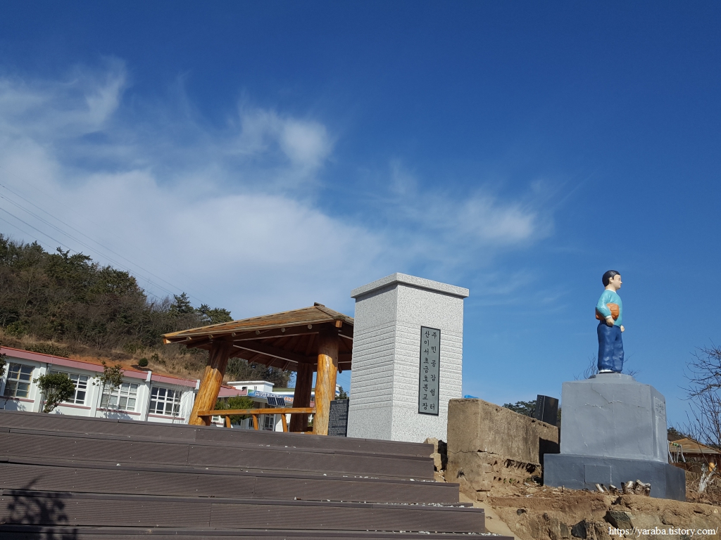 길은 금호마을을 가로질러 가는데 폐교한 산이서초등학교 금호분교 앞을 지난다. 주민공감쉼터라는 이름으로 깔끔하게 가꾸어 활용하고 있는 모습이 좋아 보였다. 학교 앞에는 까까머리 효자상도 세워 놓았다. 어린이 동상이 세워진 것은 처음 보는 것 같다. 마을의 오랜 이야기를 품고 있다. 절로 미소가 지어진다.