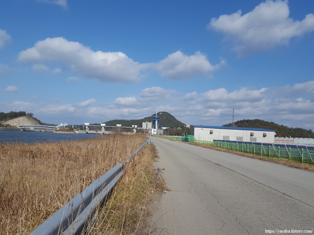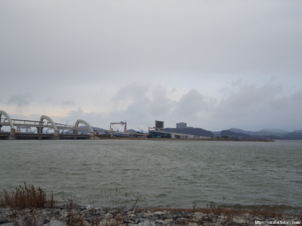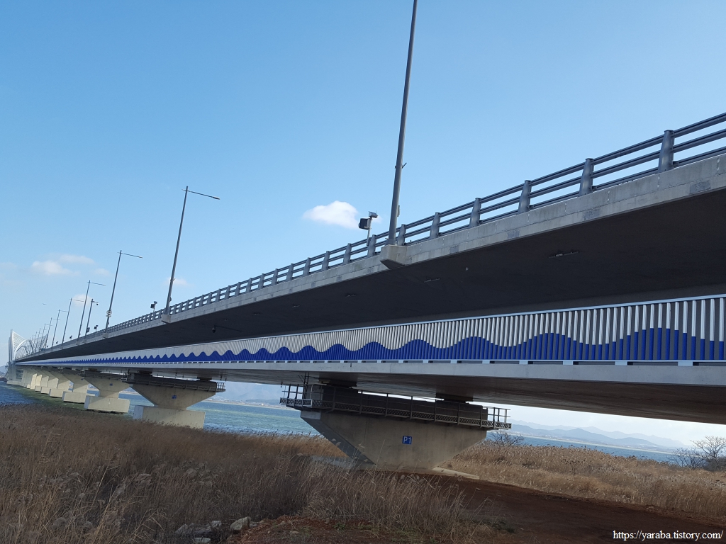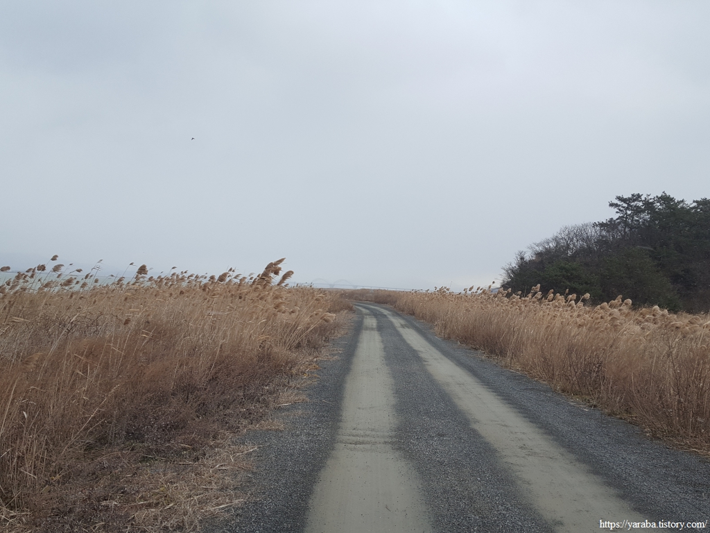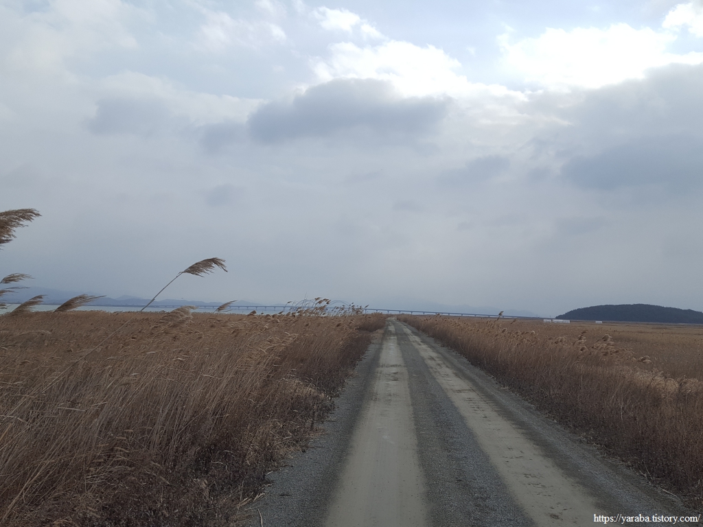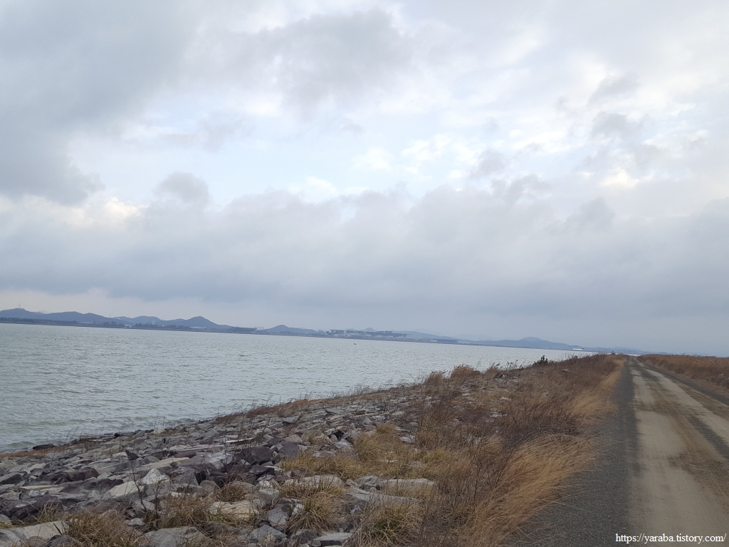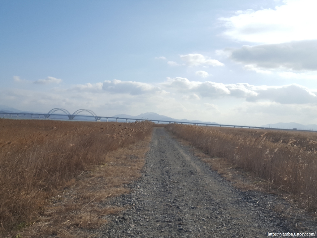 추위와 강한 바람, 호수 건너편에서 들려오는 자동차 소음만 아니라면 참 좋은 트레킹 코스임에 틀림없다. 아무튼 갈수록 영암방조제와는 멀어지고 정면의 솔라시도 대교는 점점 더 가까워진다.