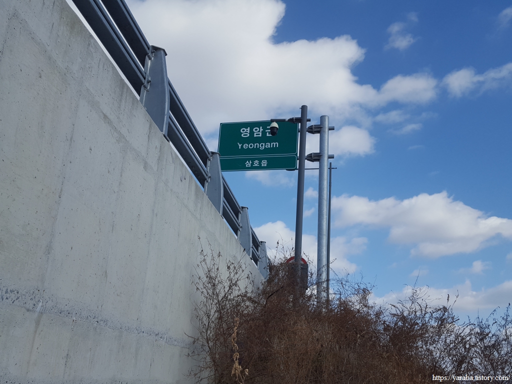다리 끝에 이르면 영암군 삼호읍에 진입한다. 다리 아래 통로를 통해서 좌측 길로 가야 한다.
