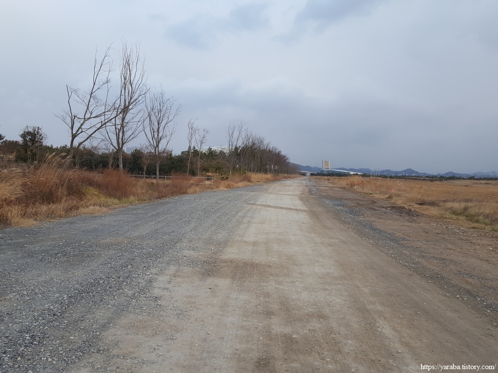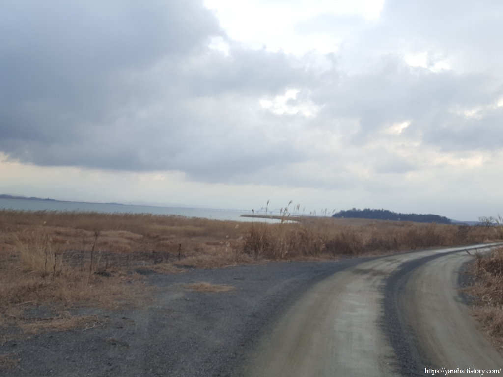 다시 호수변으로 나와서 동쪽으로 향하는 길, 멀리 기다란 솔라시도 대교가 시야에 들어오기 시작한다. 그런데, 호수 건너로 엄청난 자동차 소리가 끊임없이 들려온다. 바로 F1 경기가 열렸던 영암국제자동차경주장이 있기 때문이다. 대회가 없으면 일반인도 라이선스를 취득하고 사용료를 지불하면 주행할 수 있다 하니 끊임없는 자동차 굉음이 괜히 나는 소리가 아니었다. 소음과 미세먼지 저감을 위해서 나무를 심겠다고 하는데, 그 효과는 모르겠다.