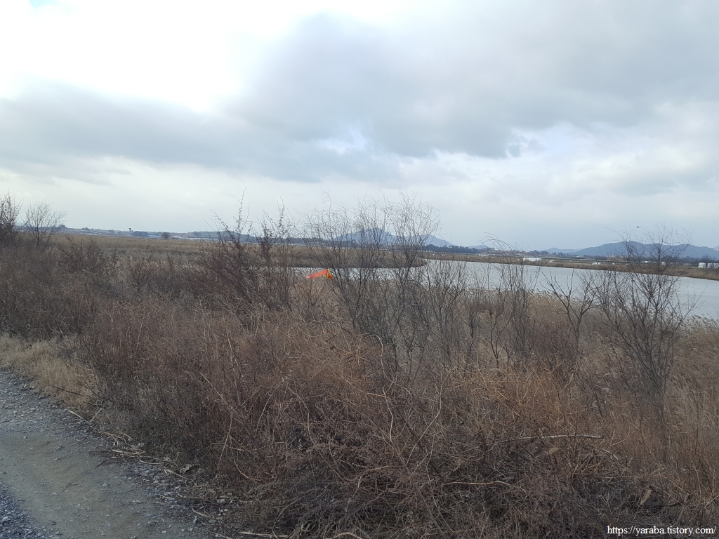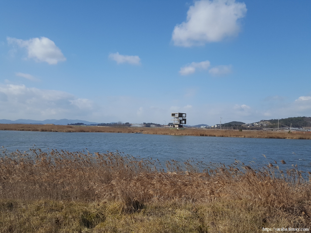이제 수로 남쪽의 건설 중인 다리도 솔라시도대교도 가물 거릴 정도로 멀어졌다. 수로 건너편으로는 탐조대도 설치되어 있었다. 코스 안내를 보면 철새가 많다고 했는데 바람 탓인지 의외로 거의 목격되지 않았다.