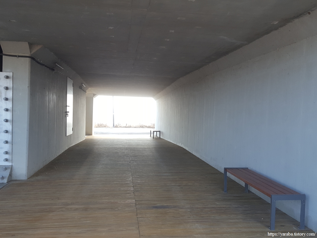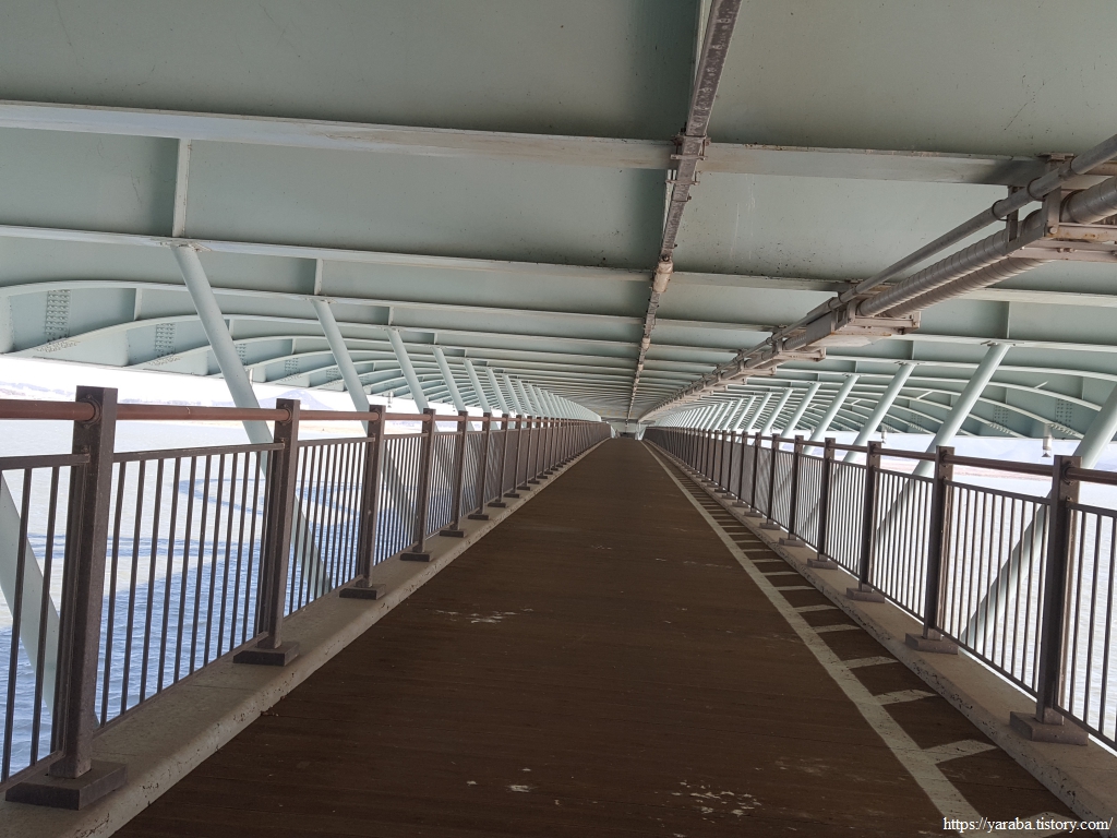 또한, 다리 양쪽 끝에서는 다리 아래로 양쪽을 오갈 수 있게 만들었다. 우리는 동쪽으로 부는 바람을 피해서 반대쪽 길로 걸었다. 양달에 바람도 불지 않으니 너무 좋았다.