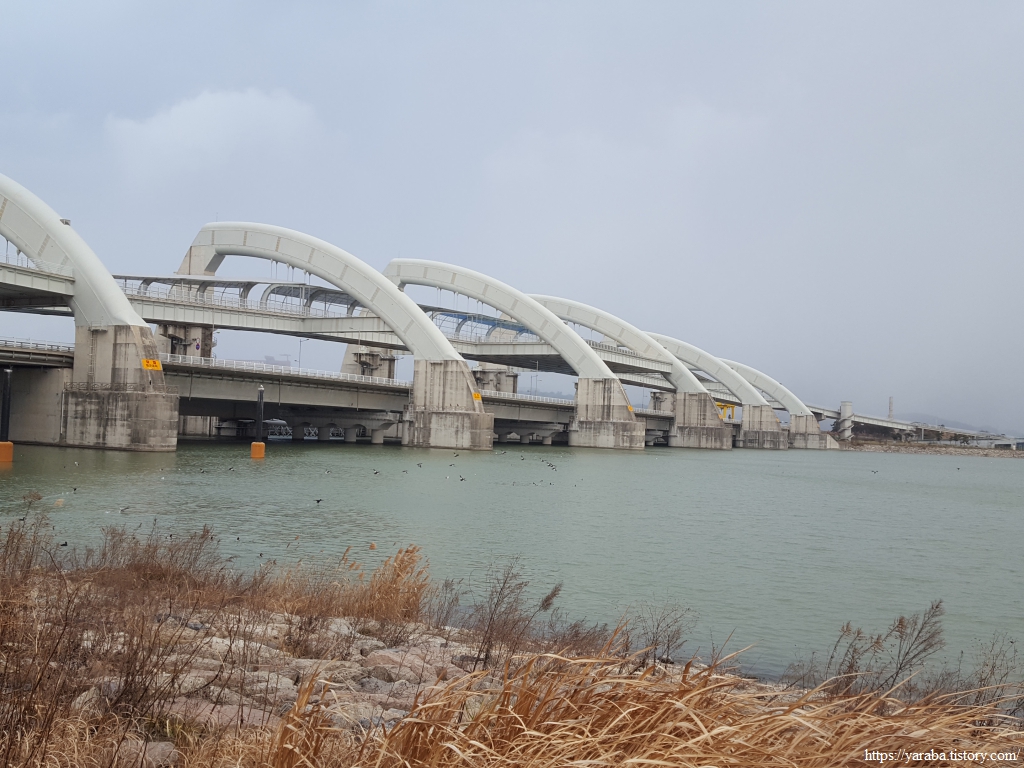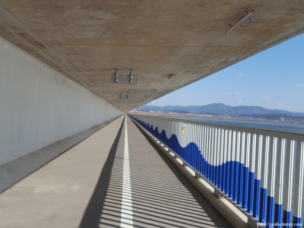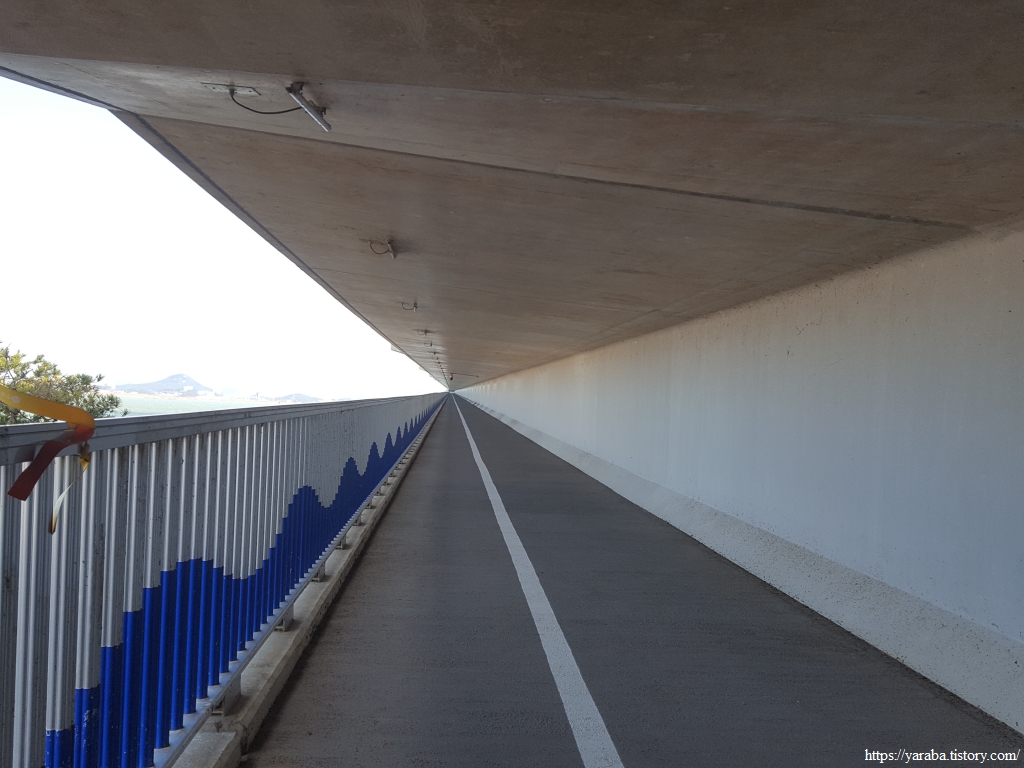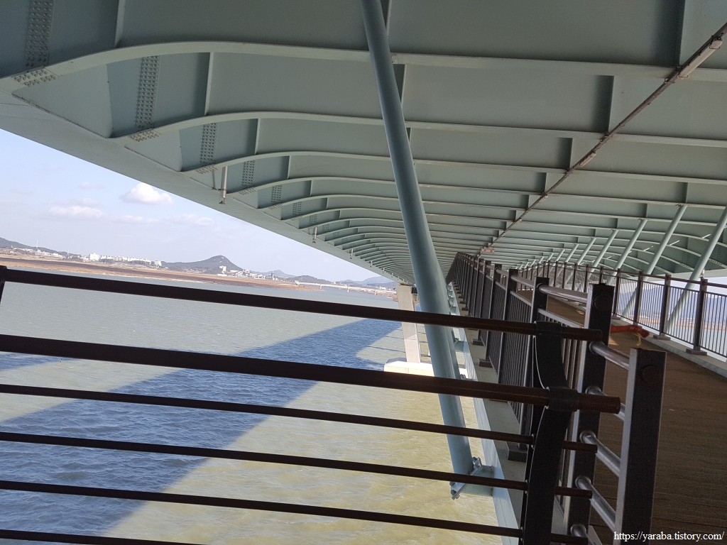 다리에 올라서면 처음 만나는 다리 구조에 탄성이 절로 나온다. 마치 2층 구조의 다리처럼 위에는 4차선의 도로만 있고 아래에는 양쪽으로 자전거길과 인도가 있는 방식이다.