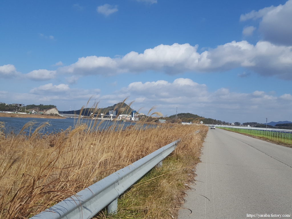 길은 다리 위로 올라가지 않고 영암호와 영산강을 연결하는 수로를 따라 북쪽으로 이동한다. 푸른 하늘에 뜬 뭉게구름이 마치 솜사탕 같다.