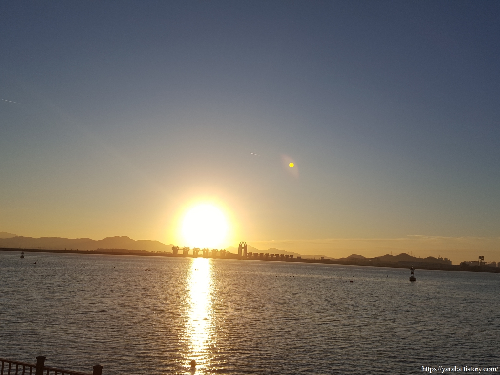 어제저녁 강하게 흩날리던 눈은 온데간데 없고 영산강 하구둑 위로 떠오르는 눈부신 아침 태양이 우리를 반갑게 맞아준다. 온 세상을 황금빛으로 물들이고 있는 아침 햇살을 받으며 해안 산책길을 따라 서쪽으로 이동한다.