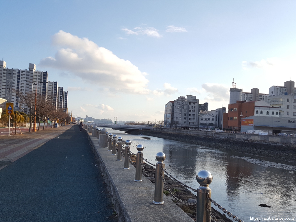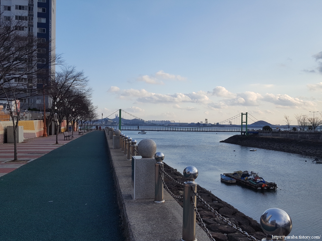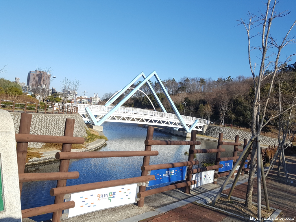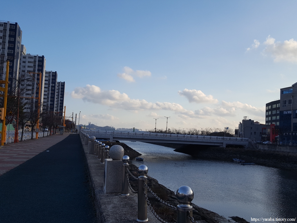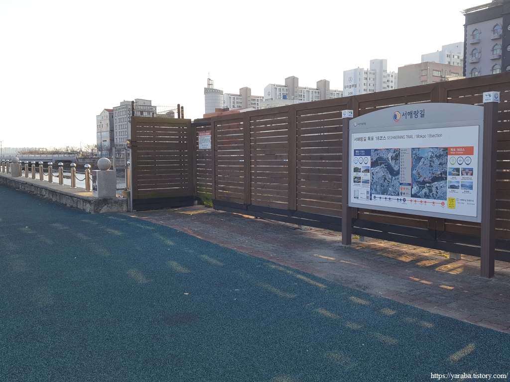 목포를 한 바퀴 도는 서해랑길 18코스는 목포지방해양수산청 앞의 삼향교 다리에서 시작한다. 일단 다리를 건너지 않고 둑방 산책길을 통해서 해안으로 내려간다.