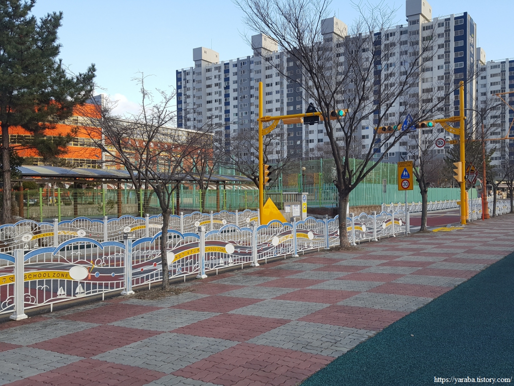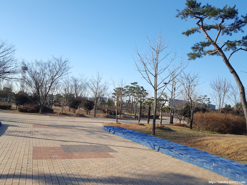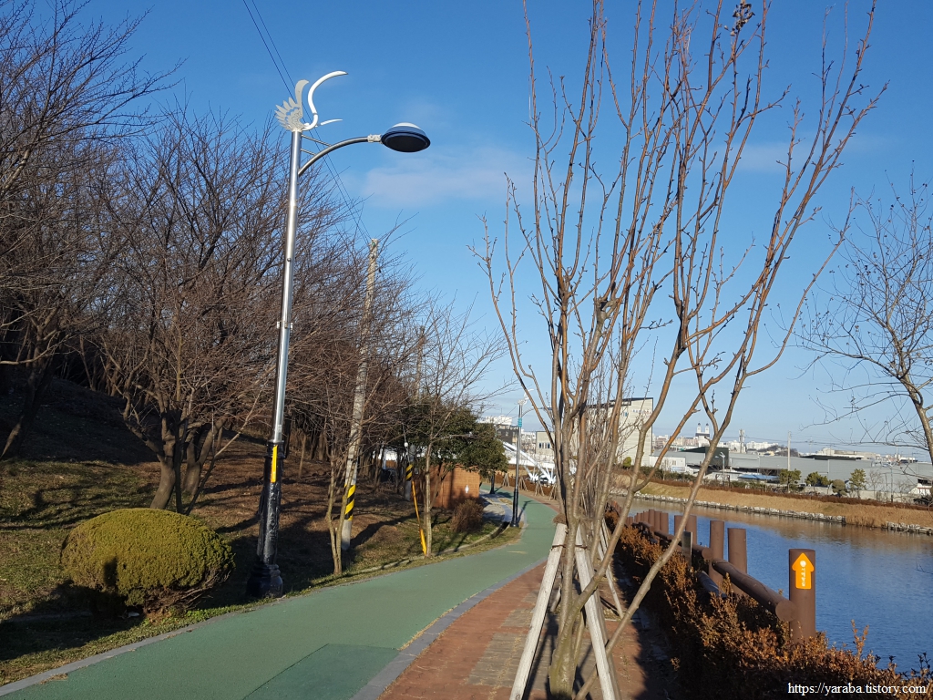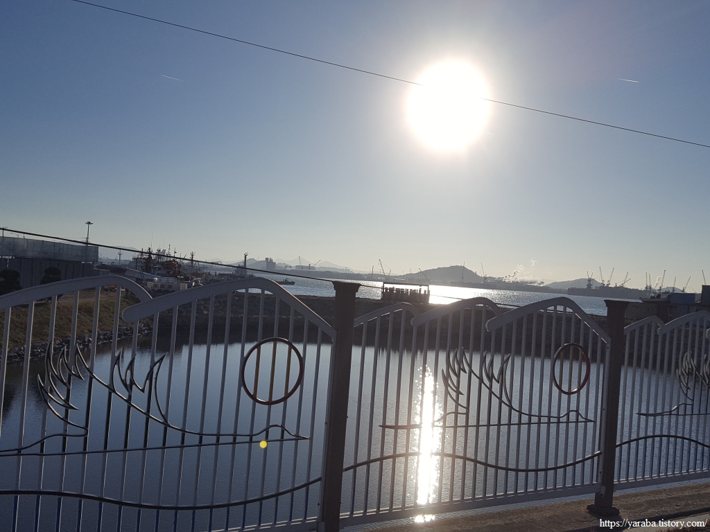 삼학교에서 남쪽으로 바라본 풍경은 대불 공단 위로 눈부신 태양이 중천을 향하고 있다. 길은 삼학교를 지나 바로 우회전하여 공원 산책길을 걷기 시작한다.