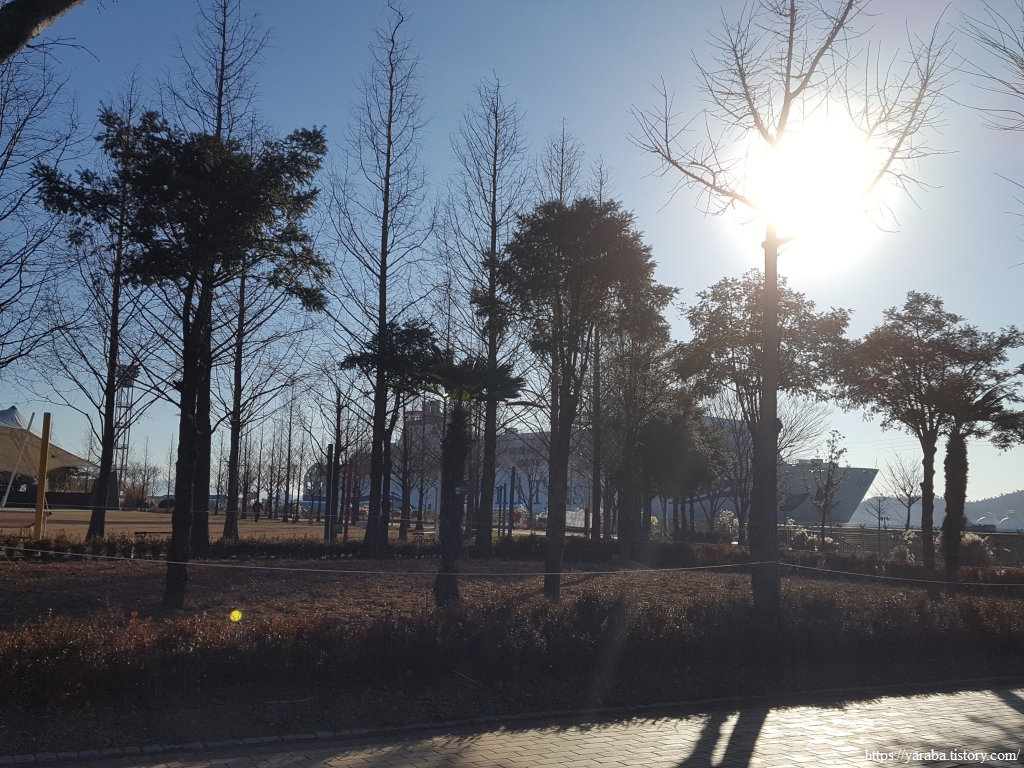 멀리 김대중노벨평화상기념관을 바라보며 삼학도 공원을 가로지른다.