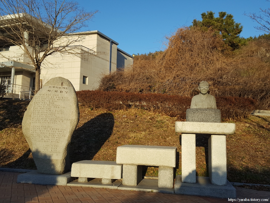 육교를 통해 도로를 건너면 목포문학관에 이르는데 그 앞에는 목포 출신의 여류 소설가 박화성의 흉상과 그의 시 "씨 뿌리는 여인아' 시비를 만날 수 있었다. 11살에 소설을 쓰기 시작한 천재 소녀로 여성 최초의 장편소설 "백화"를 집필하고 일제 강점기 목포를 무대로 노동자와 농민의 삶을 그려낸 여러 소설을 집필했다.